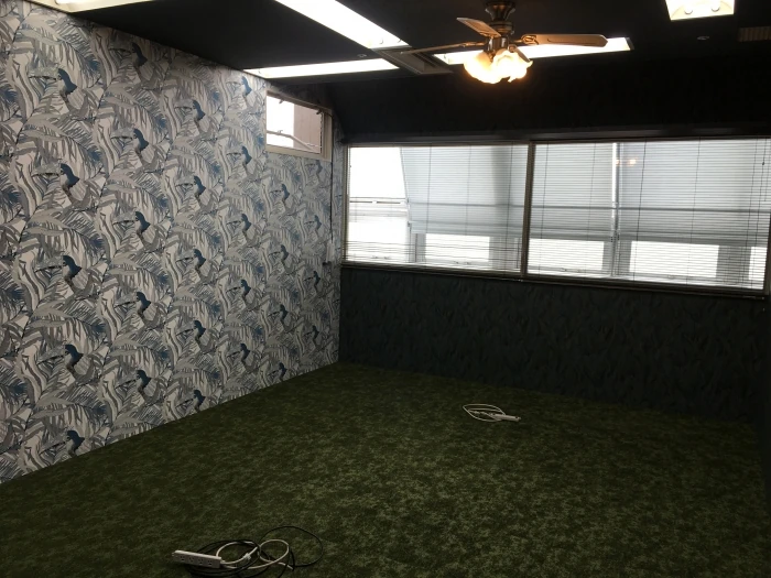 家具も入る前の本当に出来たてほやほや。この会議室も壁紙がユニークですね。選ぶ壁紙でこんなにも空間にもたらす印象が違うんだなぁと実感しました。床材も単色のカーペットではなく、深い緑、淡い緑、黒と何種類かの色がミックスされているカーペットなのでより厚みが演出されています。選ぶ素材一つ一つが空間を構成する大きな要素なんですね。