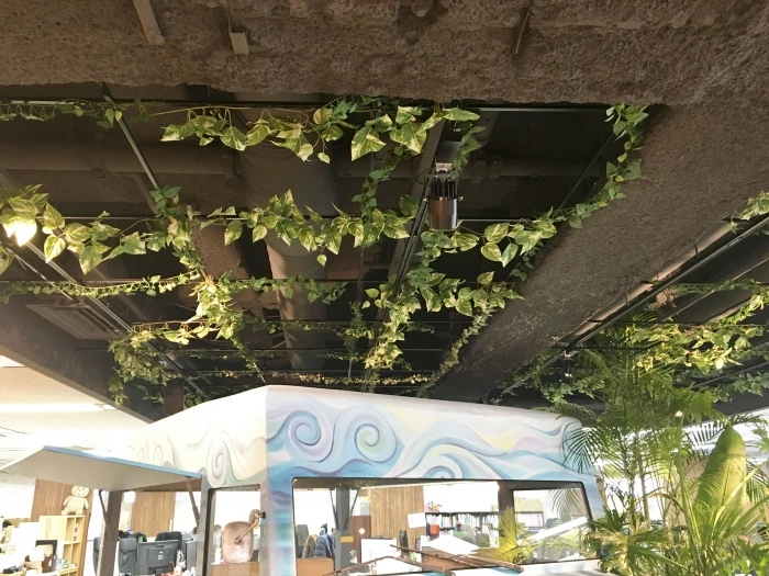 ワゴン車が置いてある箇所の天井はこのようにスケルトン天井+ルーバー+植物が施されていました。スケルトン天井にすると空間の抜け感が倍増します。確かに、せっかくワゴン車で演出がバッチリ!なのに、普通のビル天井がワゴン車ギリギリまであったら、急に現実味が増してしまいますよね。より異世界感が演出されていたのは、細かな技の積み重ねがあってこそ。大きな世界観を生み出す為には、たったひとつの物事だけ成し得るのではなく、ひとつひとつのイノベーションが重なり合うことことが重要なんだなぁと実感。