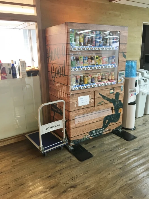 ぐるりとワークスペース内を回遊した先には自販機がありました。よくよーく見ると、ノースショア様オリジナル自販機。クリエーターsurferさんがデザインされたそう。その会社オリジナルのものがあるって、愛社心とか帰属意識に結びつきますよね。