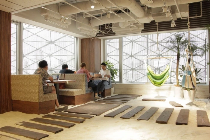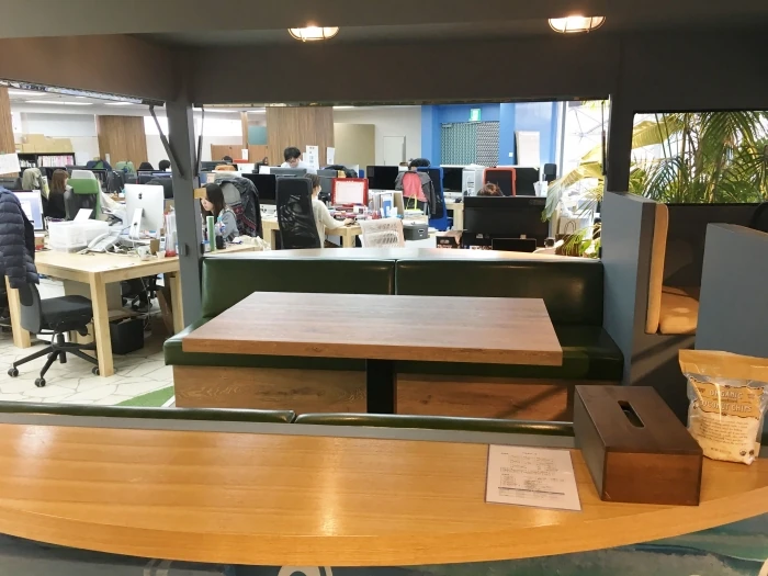 もちろん8Fのワークスペースにも白砂のエリアはあります。ただ白砂を敷いただけでなく、その上に木の板を並べ、橋のようにしているのも本当に外っぽいですよね。細かな演出が大切。窓際にはソファ席が並び、一人で作業されていたり、ミーティングされていたりしました。ヴィスにもソファタイプの席があるのですが、実はとってもミーティングしやすいんです。ソファだからか、自然と気持ちがリラックスして、とてもカジュアルにアイディアをブレストできたりするんです。