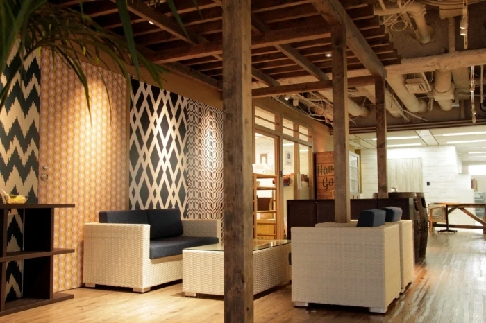 こちらのエリアもオープンで拓かれた空間ですが、見えない壁があるかのようにしっかり独立した世界観が創られています。天井の格子や柱組が本当の木なので、よりリアル感がでてまるでビーチリゾートのテラスに来ているよう・・・。壁面に見えるデザイン柄はシートなんです。9Fではデザインペイントが施されていたビルの既存壁部分ですね。8Fではデザインシート(グラフィックシート)が施されていました。シートのデザインって無限のバリエーションなので、雰囲気を変えるには本当におすすめです。個人的な意見ですが、このデザインのチョイスがかなりツボです。全て異なる柄を組み合わせるとことが・・・さすが、ヴィスのデザイナー(笑)