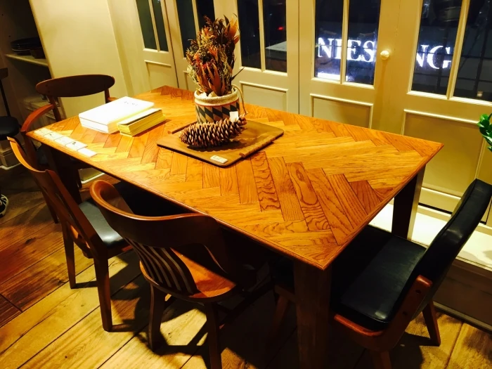珍しいヘリンボーンの天板のダイニングがありました。