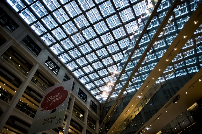 見どころは三角形の平面となっている5層吹き抜けのアトリウムです。
