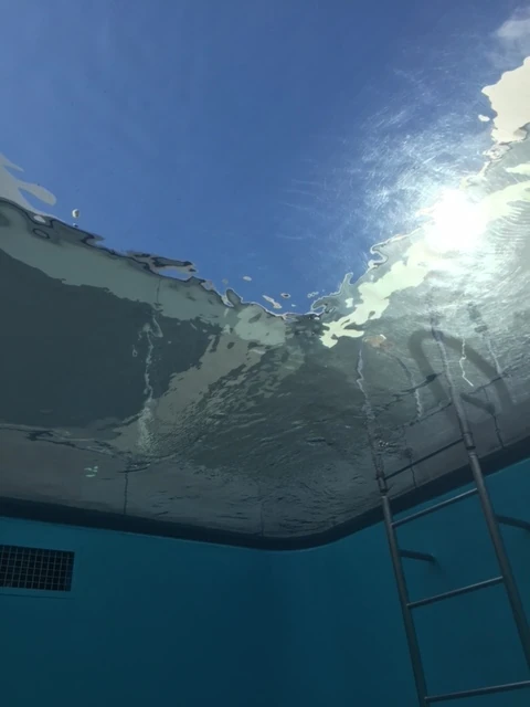 空間の上から見るとプールに見えますが、実際は中間に透明なガラスがあり、その上に深さ約10センチの水が張られているというものです。