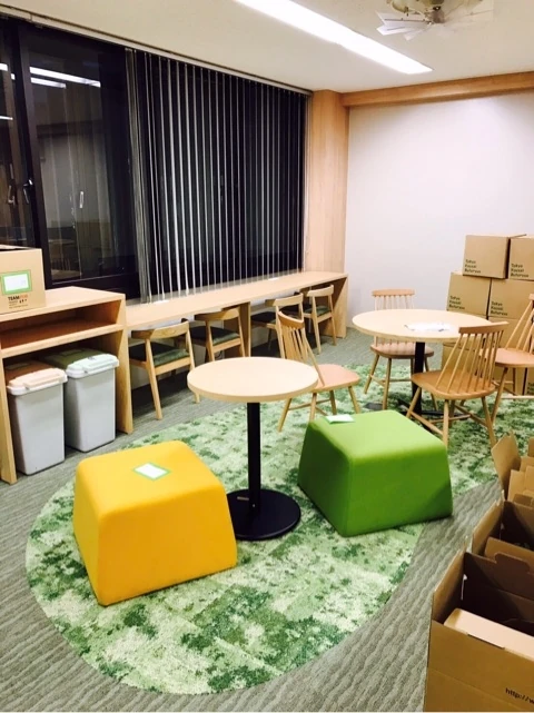 こちらはワークスペースの床ですが、こちらも海外のカーペットを3パターンでランダムに貼り分けて変化と動きをつけています!