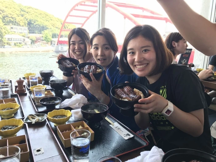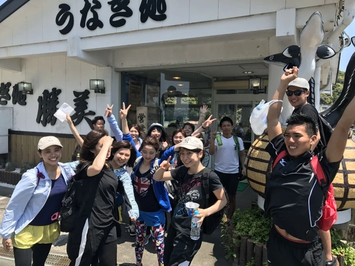 遂に、念願の鰻屋さんに到着です。この鰻屋さんを目掛けて歩き続けた午前中。最後の方は「鰻屋さんまで頑張ろう」が合言葉のようになっていました。看板が目に入った瞬間に嬉しさのあまり走り出すメンバーたち。さっきまでは足も痛くて身体も重かったはずなのに不思議と力が沸いてきます。