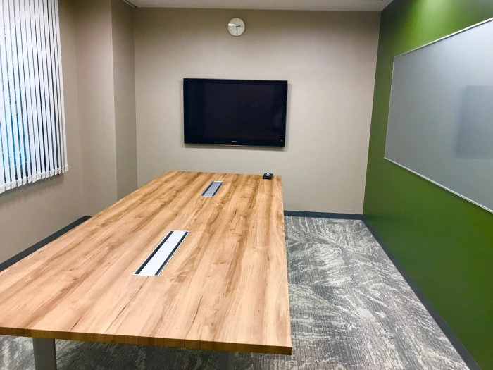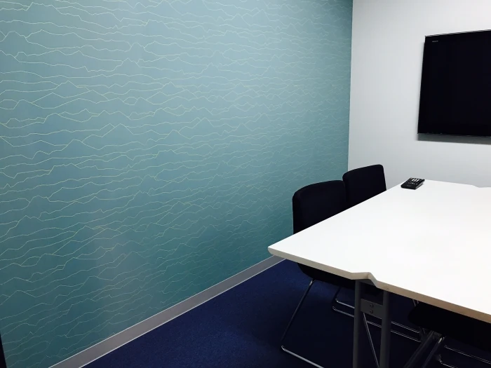 床はブルーのカーペット、会議室のテーブル天板はホワイトの会議室です。