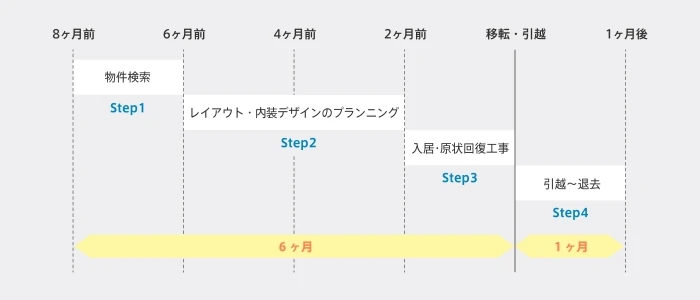 オフィス移転は、以下のようなスケジュールで進めていきます。
