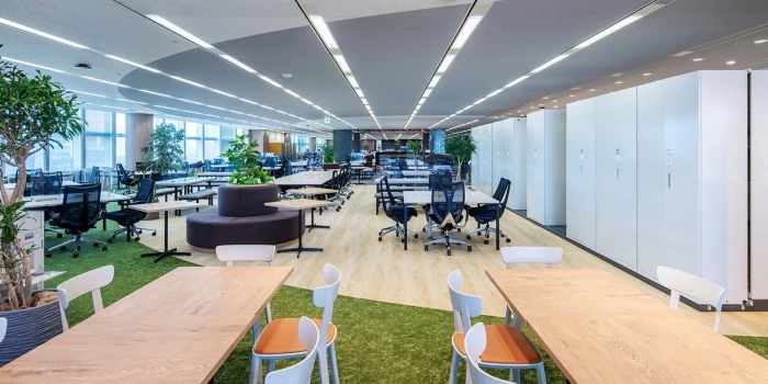 社員が個々の自席を持たず自由に働く席を選択できるオフィススタイルで、昨今主流になりつつあるレイアウトパターンです。