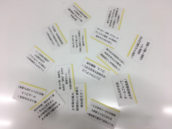 集まったコミットメントカードの中で気に入ってるのが『みんなが主役 チームプレーで上半期目標達成』です。