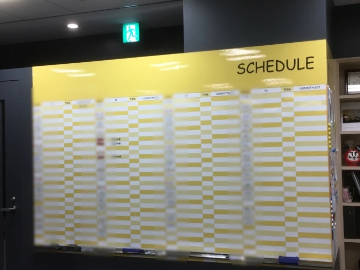 上の月一のコミットメントのほかに日々のコミットメントは個人のスケジュールボードに毎朝出勤と同時に記入します。