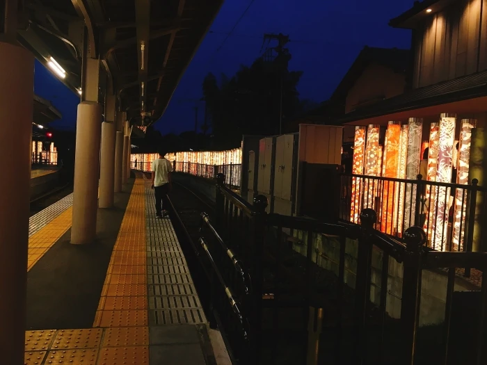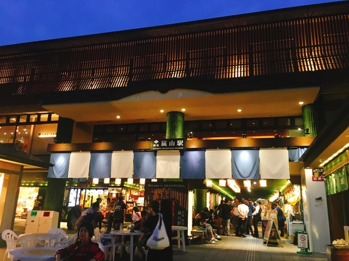 ここは嵐山駅になっていて、夜の街並みに京都ならではのデザインが溶け込んでおり、