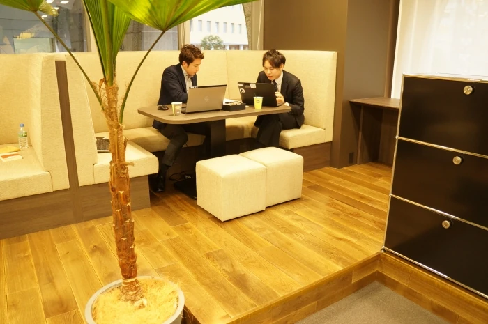 最近のデザイナーズオフィスには欠かせないといっても過言ではないくらいにトレンドなのが、ファミレス型のシート。テーブルとベンチシートがセットになっており、ブースのように使えるところが特徴です。