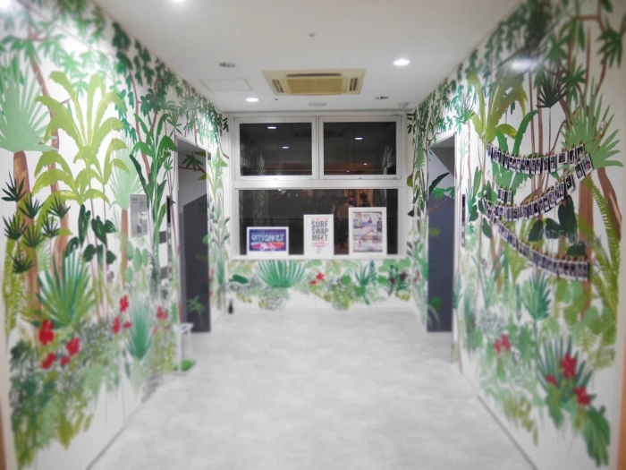 一瞬ジャングルかと思いますよね。エレベーターホールからもうノースサンド様の世界観が始まっているんです。わくわくが止まらない。実際にこれだけの量の植物を置く事はハードルが高いかもしれませんが、壁にペイントであればその後のメンテナンスも不要。そして長くこの景色を楽しめるんです。