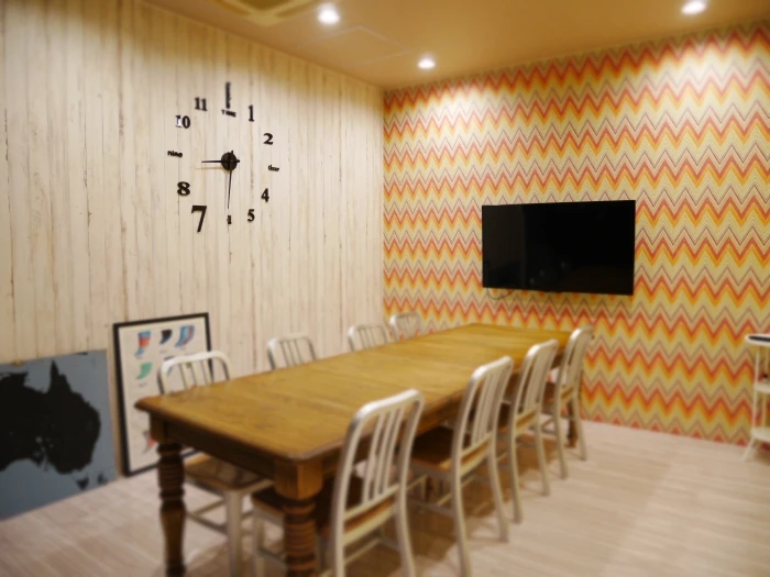 会議テーブルも普通の会議テーブルではなく、ダイニングテーブルのような厚みのあるどっしりとした木テーブルなので、よりホーム感が増してます。
