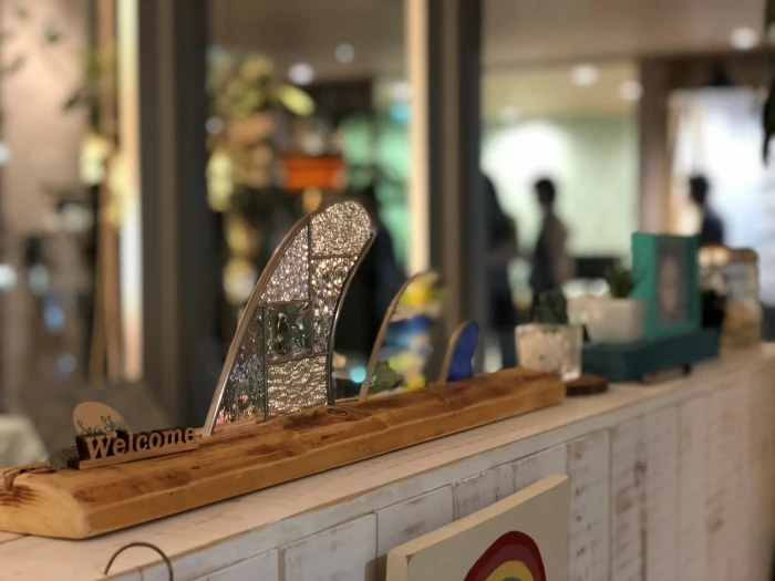 サーフっぽいイメージのインテリア小物を壁に掛けるかどうかで、この会議室空間の印象はまた違っていたはず。センスが光ります。