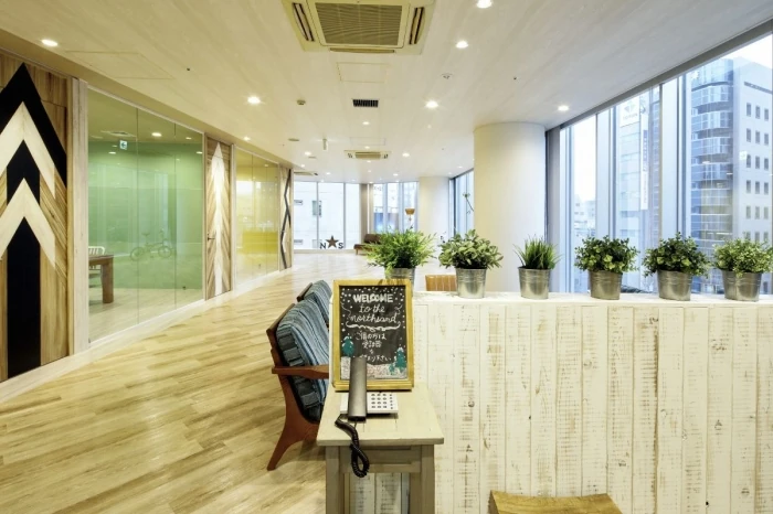 空間全体が西海岸風デザインになっているので、オフィスとは思えない空間ですよね。窓面も大きく採光も多くとれるので、かなり明るい印象のエントランスラウンジスペース。
