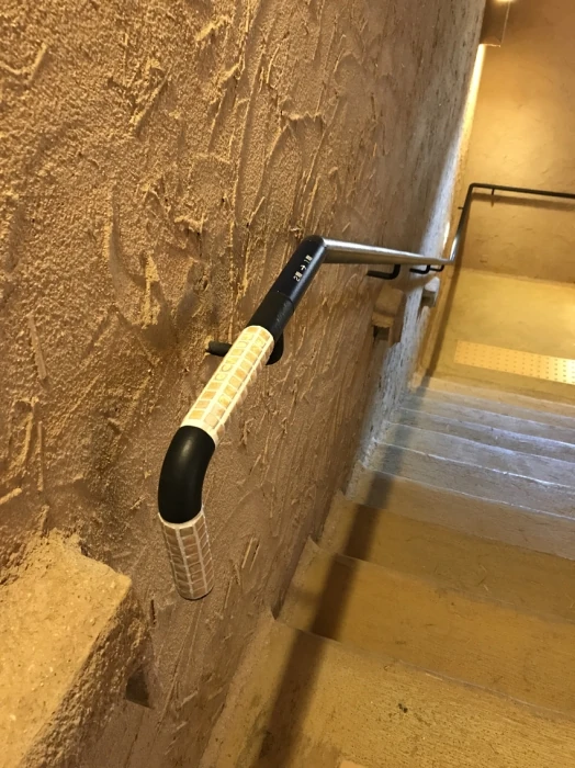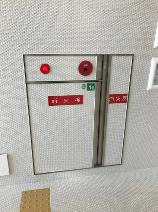 細かなところでは、階段の手すりまでモザイクタイルが貼られていたり、消火栓の扉にもびっしりとモザイクタイルが貼られていたりと、これでもかというほどタイルづくしの空間デザインに仕上がっていました。