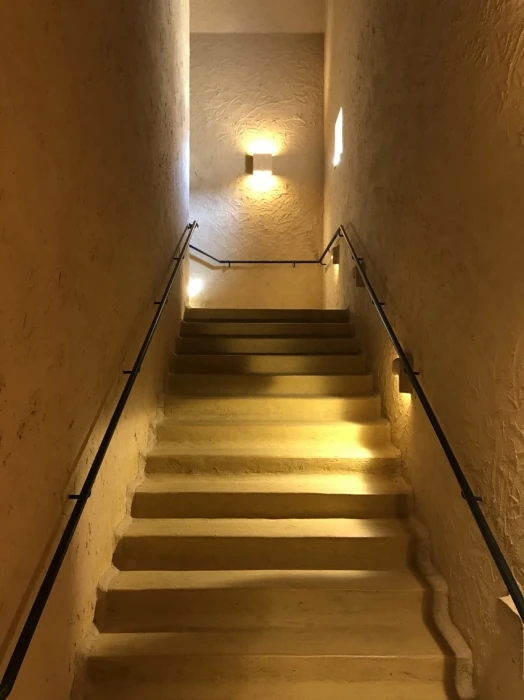 外観でも十分にインパクトを感じたのですが、内部に入ってまたWAO!を感じてしまいました。私が特に感銘を受けたのが、建物全体を貫く階段で、土で内装が仕上がっていることもあり、まるで洞窟の中を歩いているような印象でした。