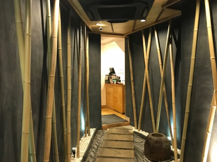 竹に墨入モルタルや石といった和の素材をふんだんに盛り込んだかっこいい空間になっています。