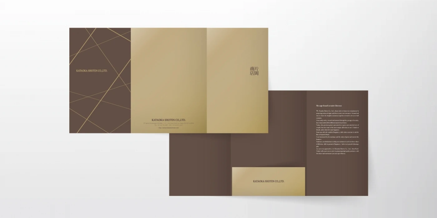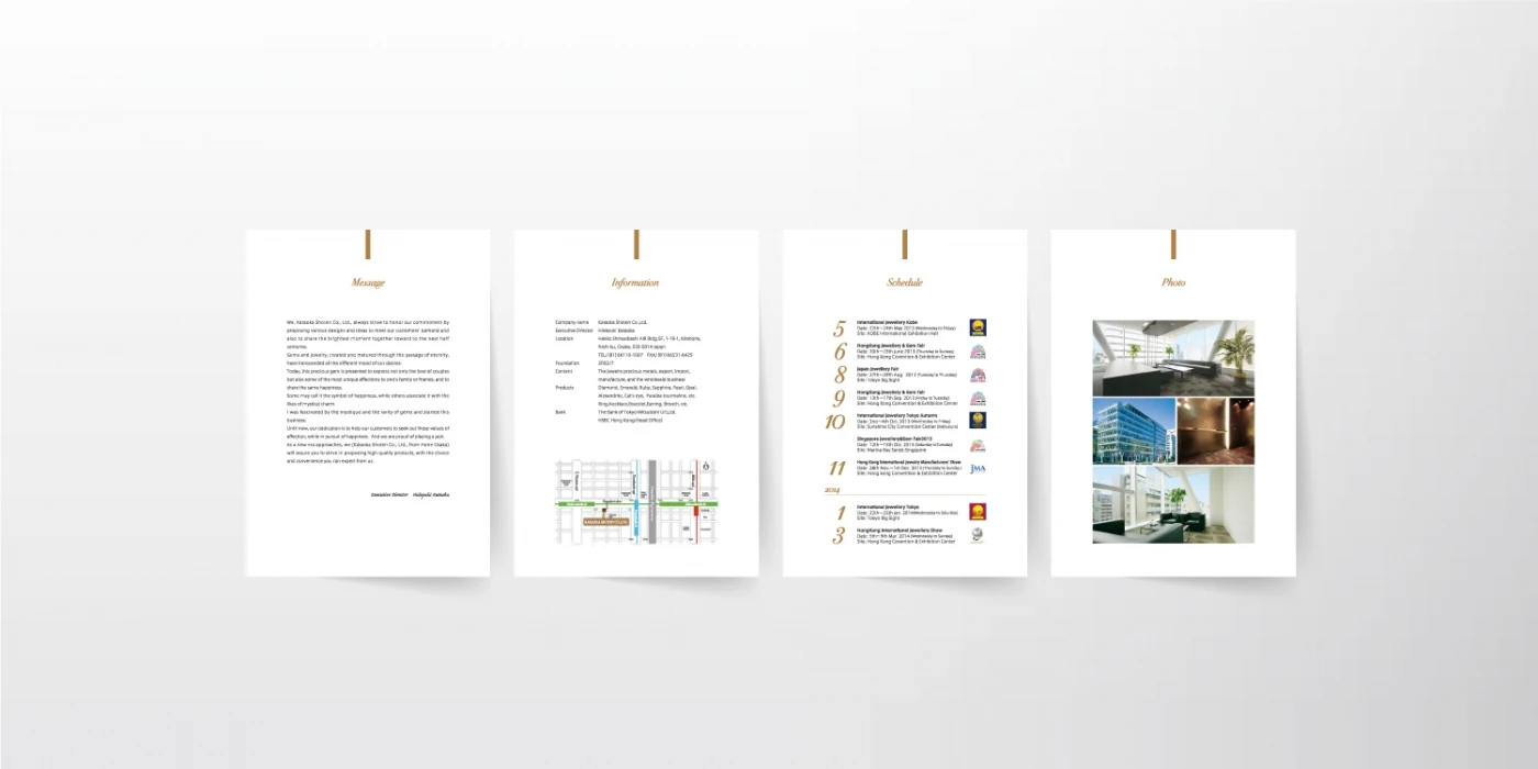 大阪から世界へ、国内外で活用できるパンフレットを制作しました。正規宝飾専門店として高級ジュエリーを企画・製造・販売・輸出をする企業を表現するため、表紙は高級感と安心感を与えるカラーにし、ダイヤモンドをリカットするイメージをデザインとして施しました。ダブル表紙を採用し、1冊で表紙のデザイン、イメージ、与える印象を変化できるようにしています。