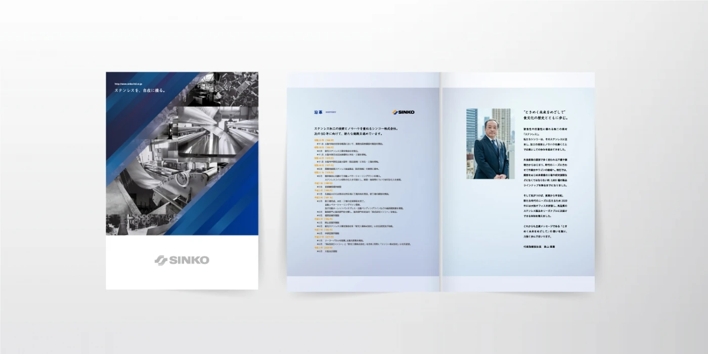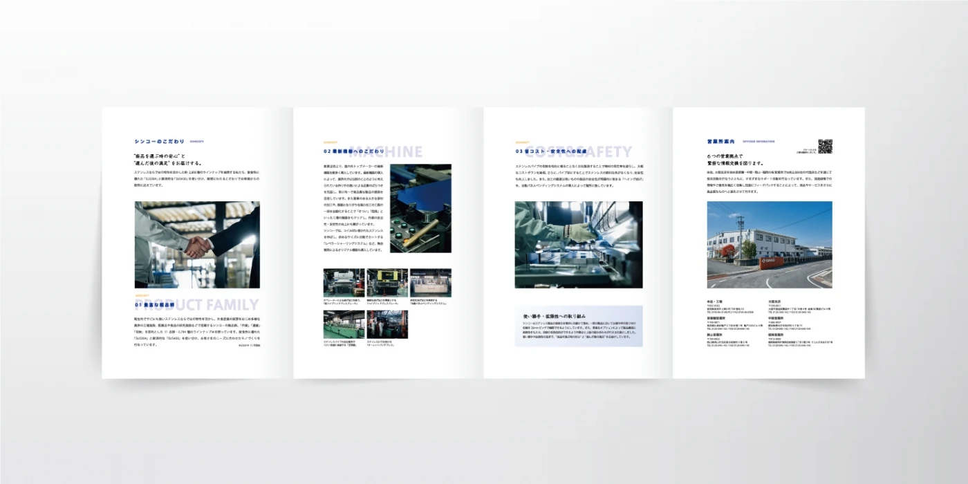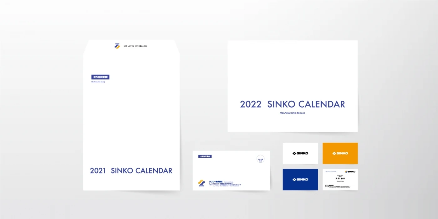 コーポレートwebサイトのリニューアルに連動した、次の50年に向けたリブランディングプロジェクト。会社案内、名刺、カレンダー、封筒などDTPツールのデザインを一新しました。シンコー様のモノづくりに対する真摯な姿勢やこだわり、働く人の安全性やお客様を大切に考える企業としての誠実さが伝わるよう意識しデザインしています。ステンレス加工のイメージでパンフレットや名刺にはロゴの箔押しを使用しました。ビジュアルイメージを統一することでシンコーブランドの訴求を最大限に発揮しています。