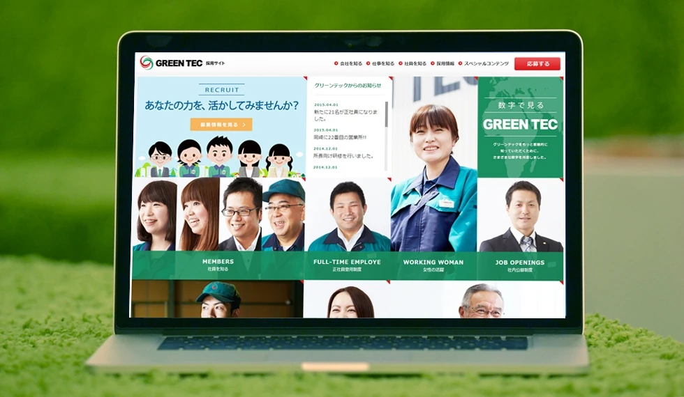 働く“人”にフォーカスを当てたリクルートサイトを製作しました。未経験の方でも、会社のこと、仕事内容のこと、どんな仲間と一緒に働くのかを分かりやすく伝えるため、働き方を軸に仕事内容を語っていただくアンケートを実施。それを元に、想いや働き方をコンテンツとして掲載しています。メインビジュアルには、“たくさんの仲間”がいることを感じていただけるように、一覧性を高める可変グリッドレイアウトを採用。またWEBサイトの運用面でも、使い勝手を良くするために、更新頻度の高いお知らせ追加機能の管理画面には、簡単に更新できるCMSを導入しています。
