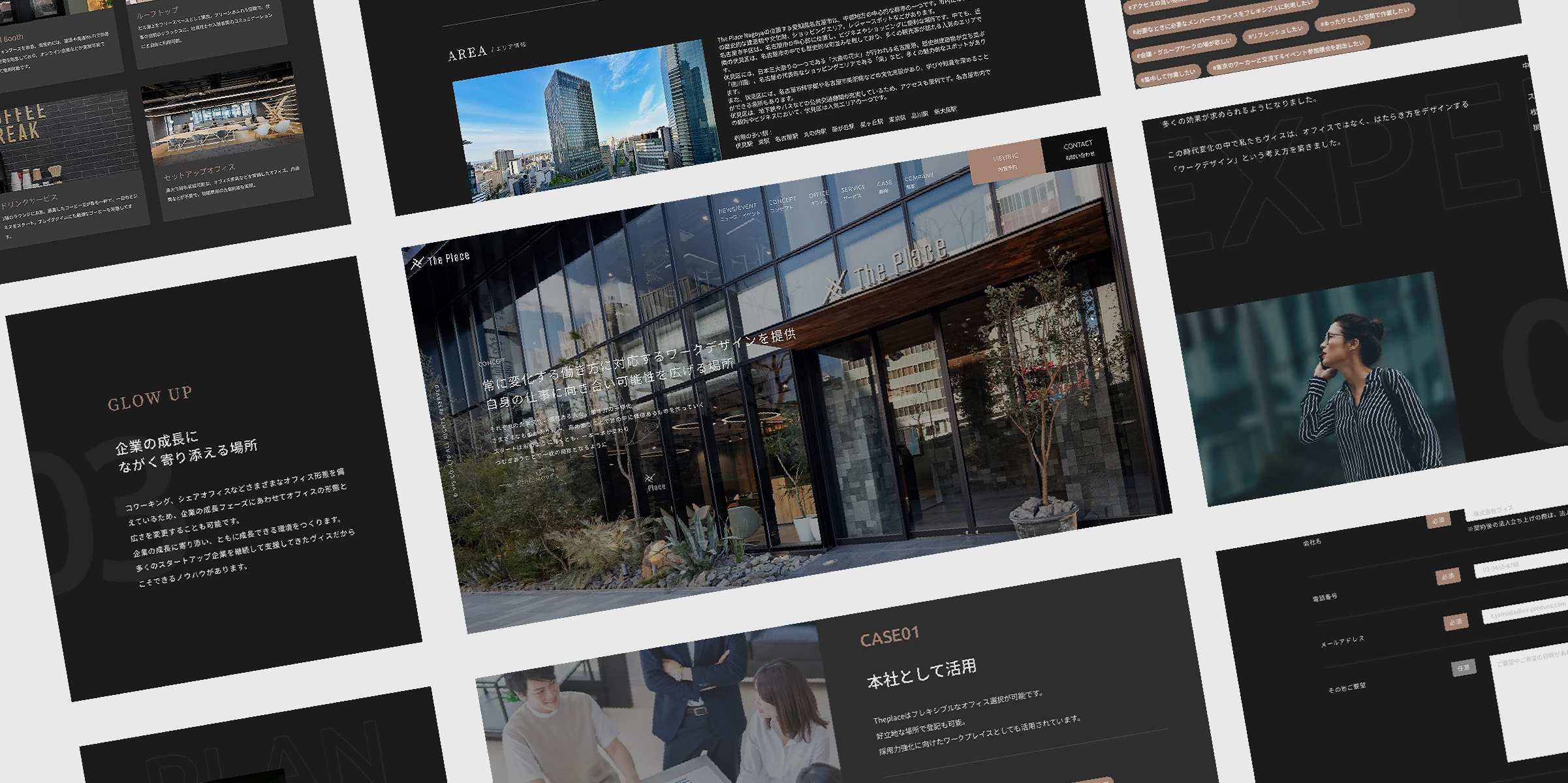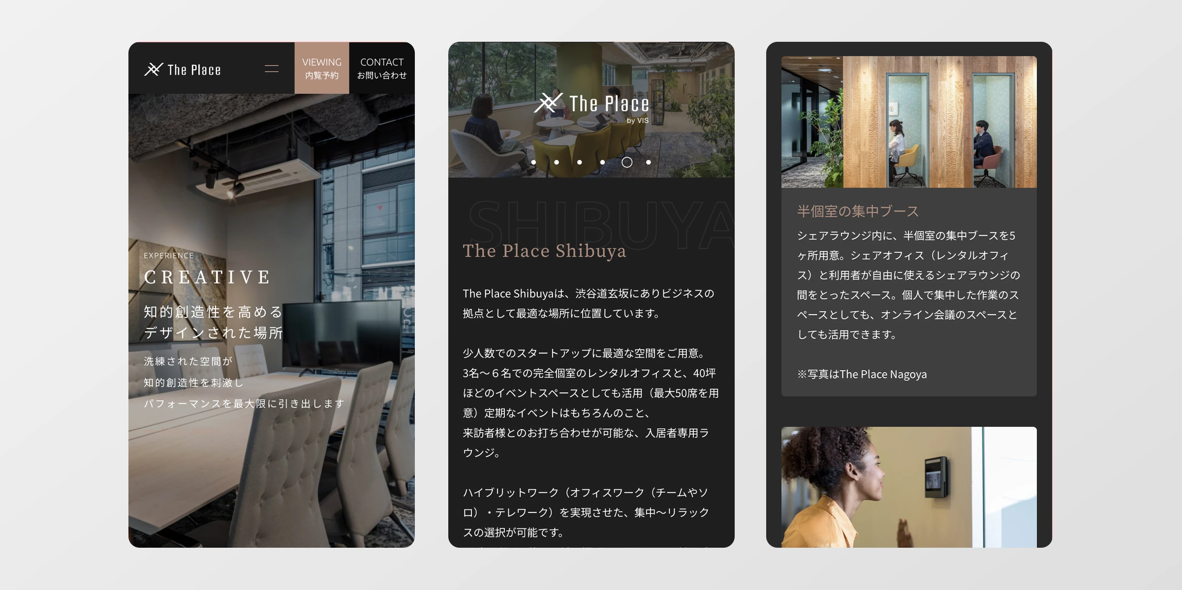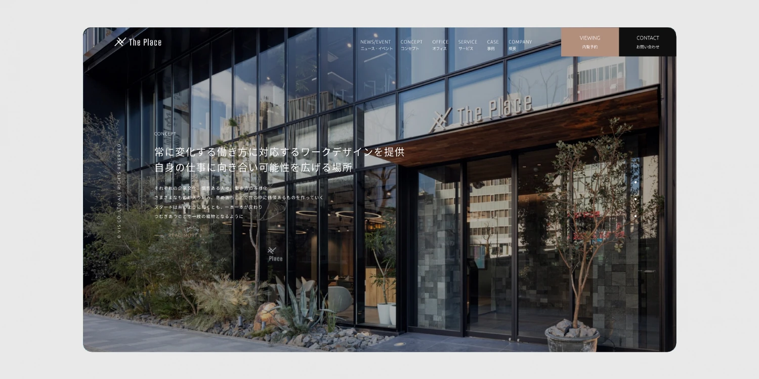 ヴィスの運営するオフィスビル「The Place」専用サイトを制作しました。「TSUMUGI」をコンセプトに、企業や人、働き方が交わることで新しい価値を生み出すことを支援しており、その想いが伝わるよう、「SOCIAL」「CREATIVE」「DISCOVERY」のキーワードを元に具体的に表現しました。黒を基調とした色味を使用することで、落ち着き・モダンな雰囲気を演出し、ビル内装写真の有彩色を最大限に引き立てるように構成しています。また、各写真を大きく掲載し、動きを施すことで、ビジュアルからユーザーの心に強く残るシックで高級感のあるデザインに仕上げました。