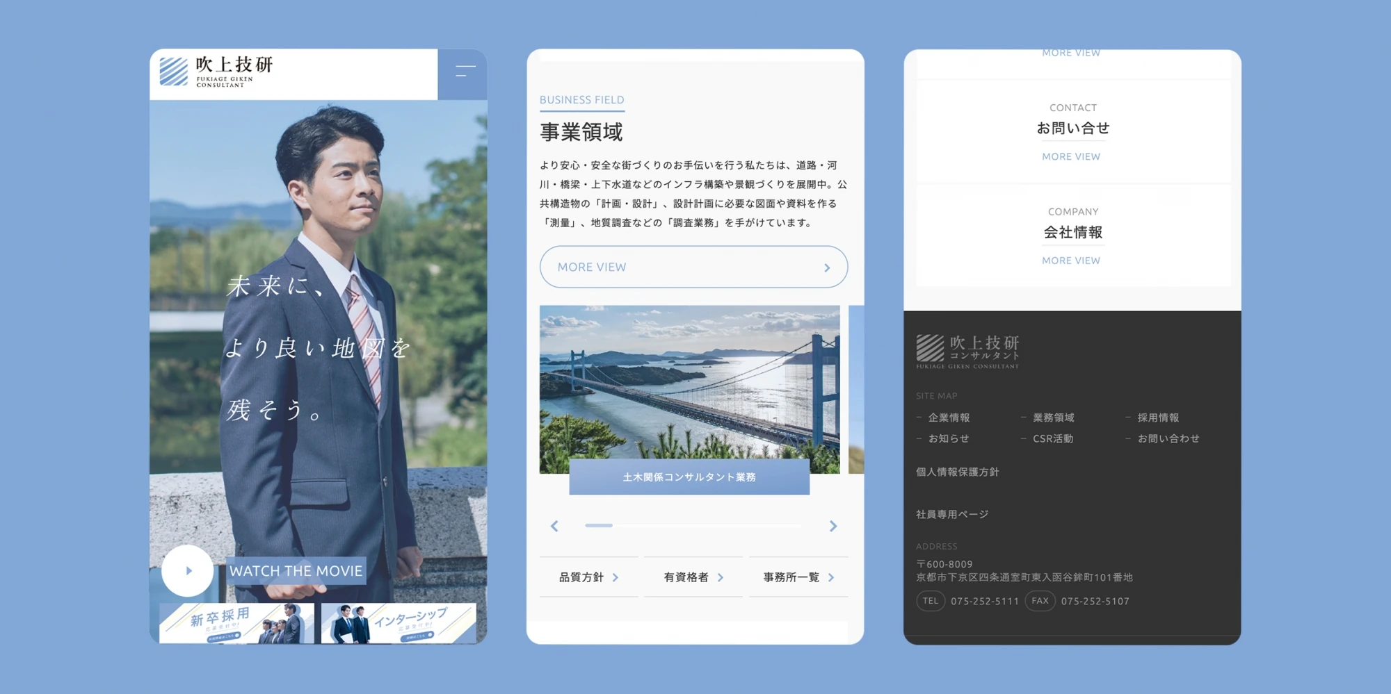 リブランディングを目的としたコンセプトメッセージの策定、ロゴデザイン・コーポレートカラー・WEBデザインの刷新をお手伝いしました。ロゴ等のデザインから一貫して、WEBサイトのデザインも未来を描く企業ブランドを最大限訴求するようまとめました。未来に向けた採用活動も意識し、採用メッセージ、社員を大切にする企業風土や環境にもフォーカスを当てた構成にしました。さらに、地元京都を中心に50年以上の実績を重ねた企業としてのイメージを訴求するプロモーションムービーをドローン撮影も活用して制作し、サイトへ組み込みました。デザインだけではなく、WEBサイトの導線やユーザビリティも十分に考慮しています。