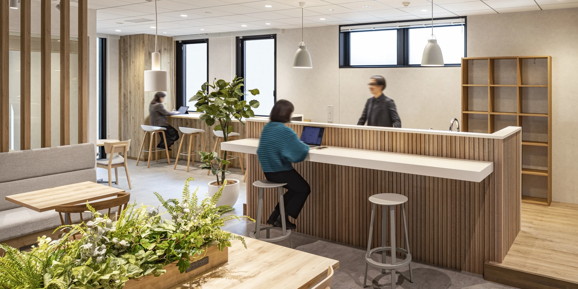 不動産会社様の新築ビルに設けるハーフセットアップオフィスを構築しました。入居コストを抑えられ、レイアウトの自由度も高いハーフセットアップオフィス。オフィスへの新たな入居者をターゲットに、入居エリアのエントランス側半分をデザインしました。今回は「オープン×Natural = GARDEN」「セパレート×Industrial = BASE」という2つのテーマを設けて、2フロアをデザインしました。「GARDEN」は、来社者を自然に誘う斜めの通路に、緩やかに空間を仕切るルーバーが特徴。「BASE」は来社動線を短く設計し、会議室奥に社内コミュニケーションスペースを広げました。どちらも特徴のある空間です。
