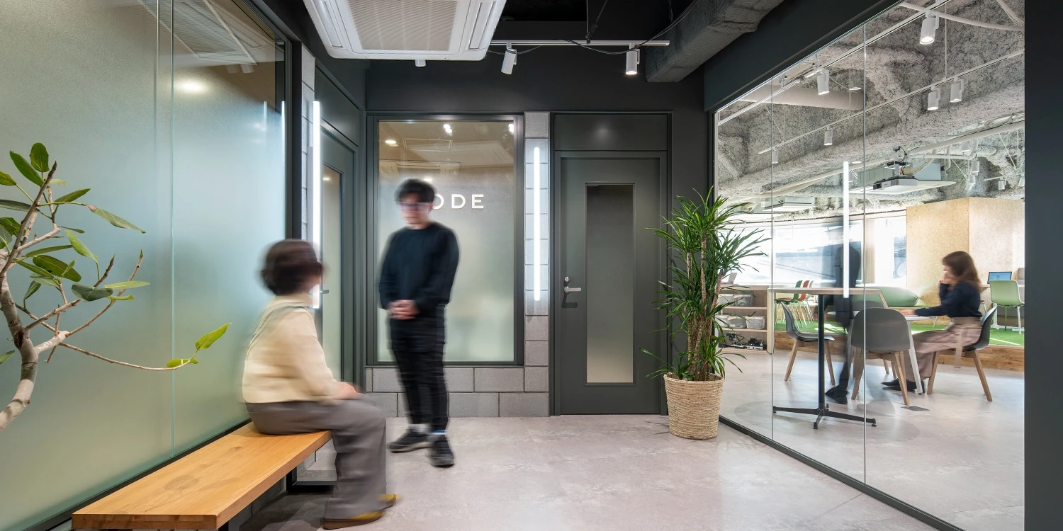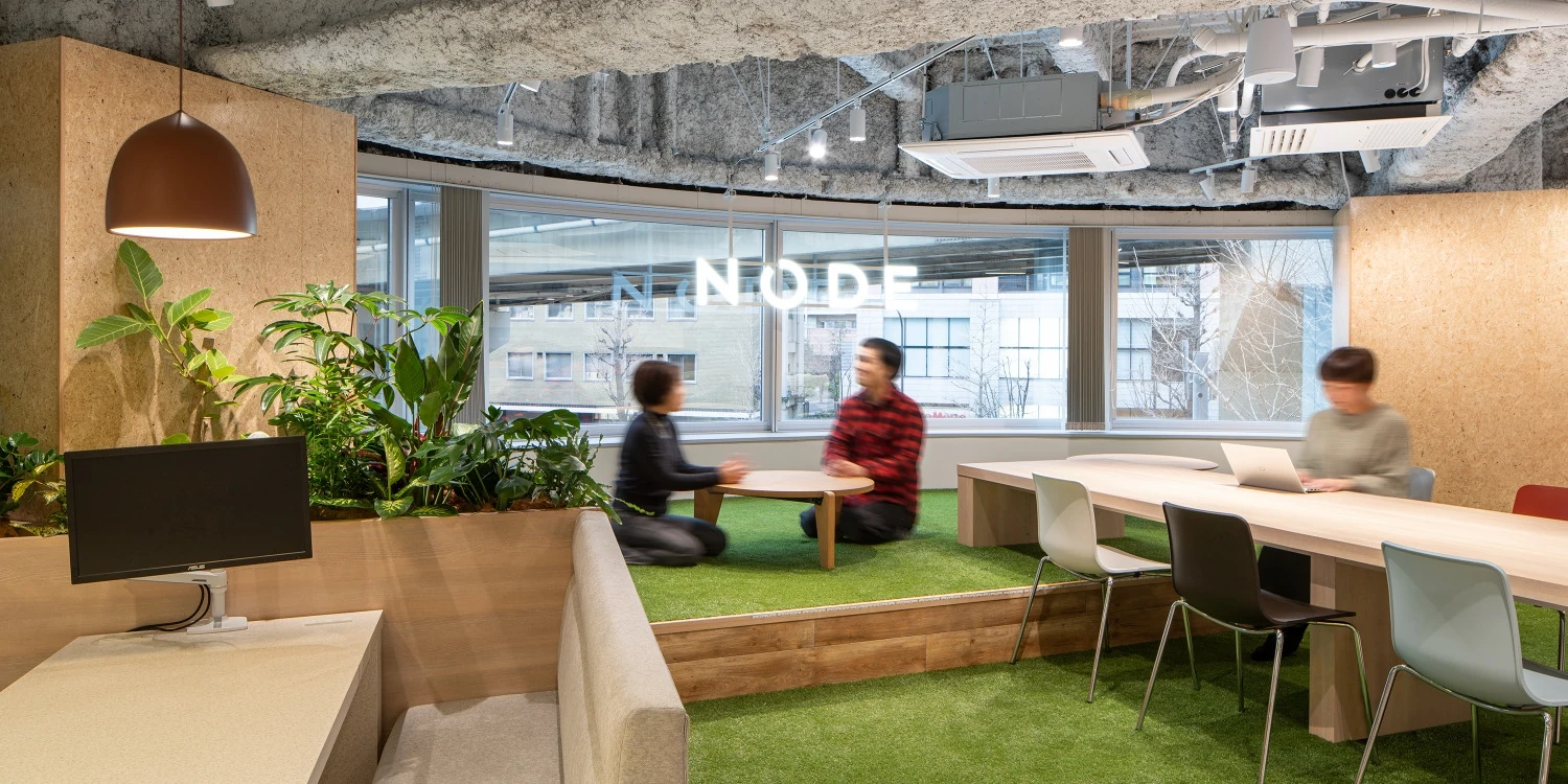 エントランス・会議室を取り囲むように様々な利用シーンを設定したワークプレイスを設けました。あえて見通しが取れない空間にすることで、集中からコミュニケーション、休憩まで自ら選択して過ごすことができ、つながりがありつつも音が気にならないようレイアウトしております。エントランスから続くフリースペースは、セミナーやプレゼンテーションなどのビジネスシーンから飲食を交えたコミュニケーションまで幅広く使えます。オープンエリアの中央には芝生のステップフロアを設け、段差をまたぐ形で大テーブルを設けました。床の高さが変わることで、ハイテーブル/テーブル/ローテーブル3つの使い方ができるようになっています。用途が変わっても使用者同士の目線が合い、コミュニケーションを取りやすいよう工夫しています。