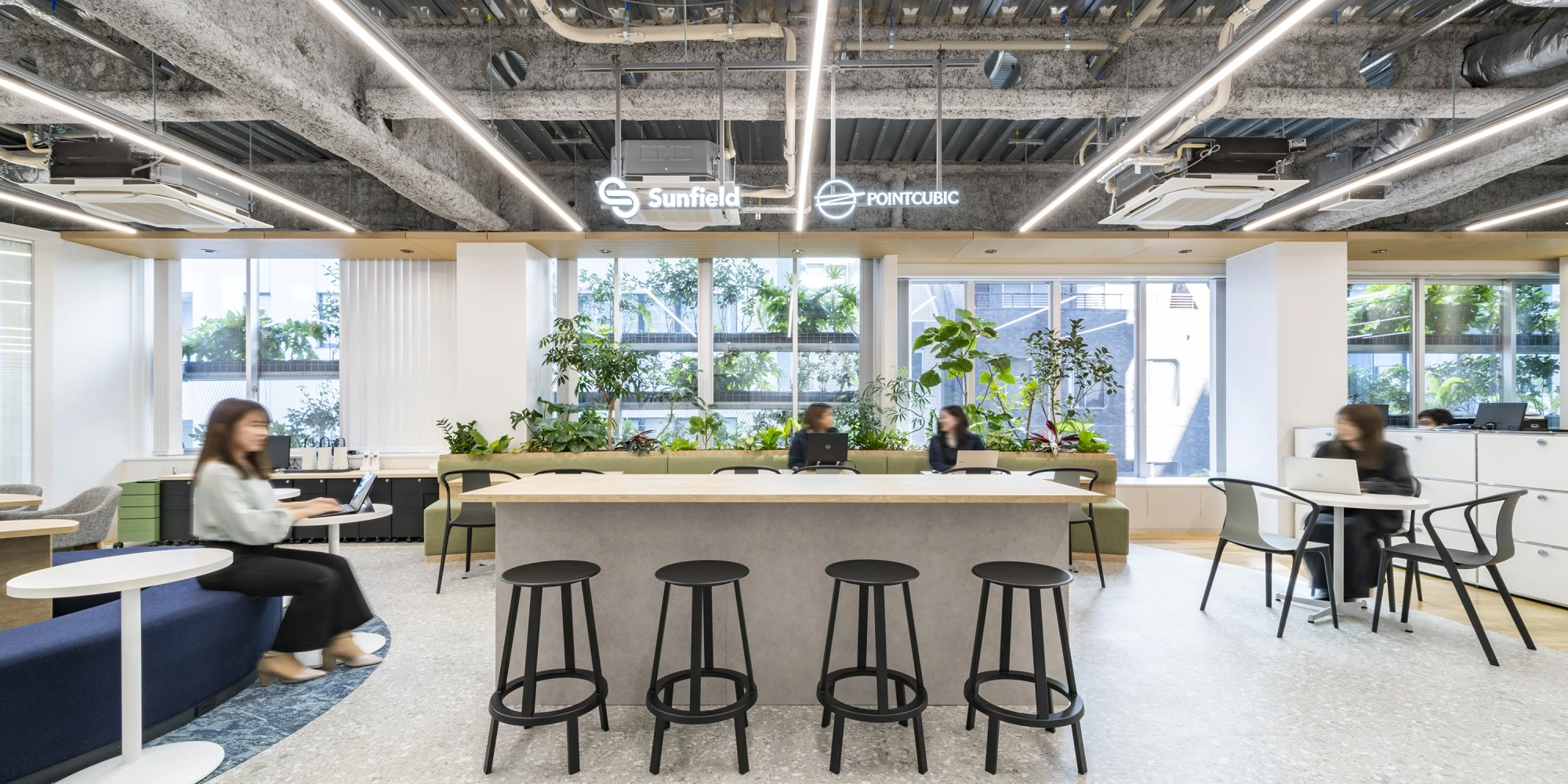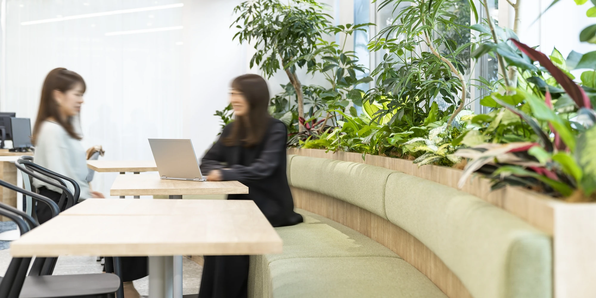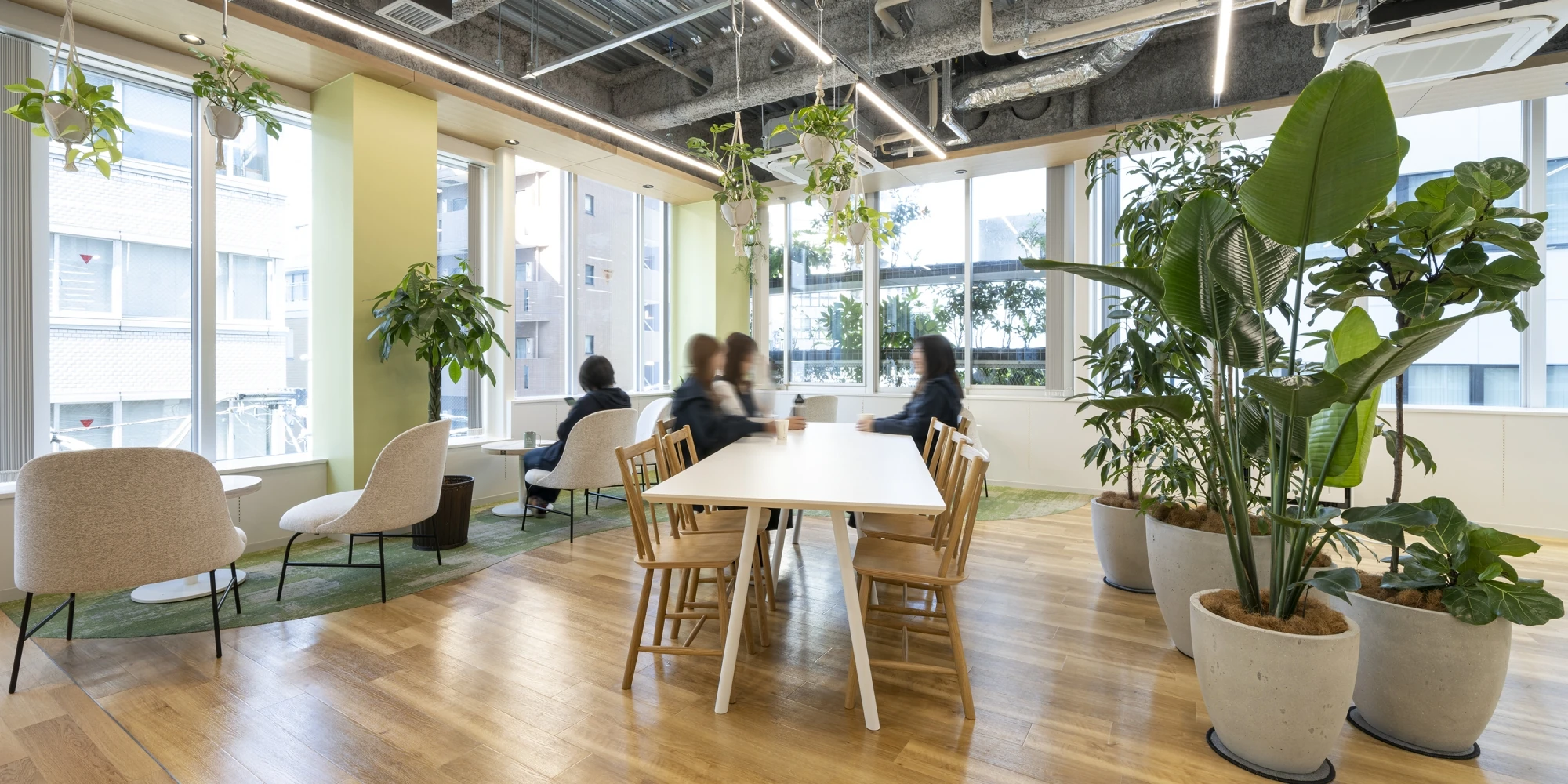 社員の過ごしやすさを最優先したいという代表者様の想いとともに移転プロジェクトがスタートしました。窓が多く、スケルトン天井での引き渡しという物件の特徴を活かし、社長室と会議室以外のエリア(エントランス、ワークスペース、リフレッシュスペース)は間仕切りを設けない開放的な設計としました。クリーンエネルギーを取り扱っている会社ということもあり、企業ブランディングのひとつとして、グリーンと木目のマテリアルやアースカラーを多く使用し、より自然を感じられるデザインになっています。ワークススペースは一部フリーアドレスを採用し、仕事内容や気分に合わせて席を選択できるABWを採用しています。「Raise(育てる、育む)」というコンセプトの通り、太陽と自然の下でのびのびとはたらくことができる空間となりました。