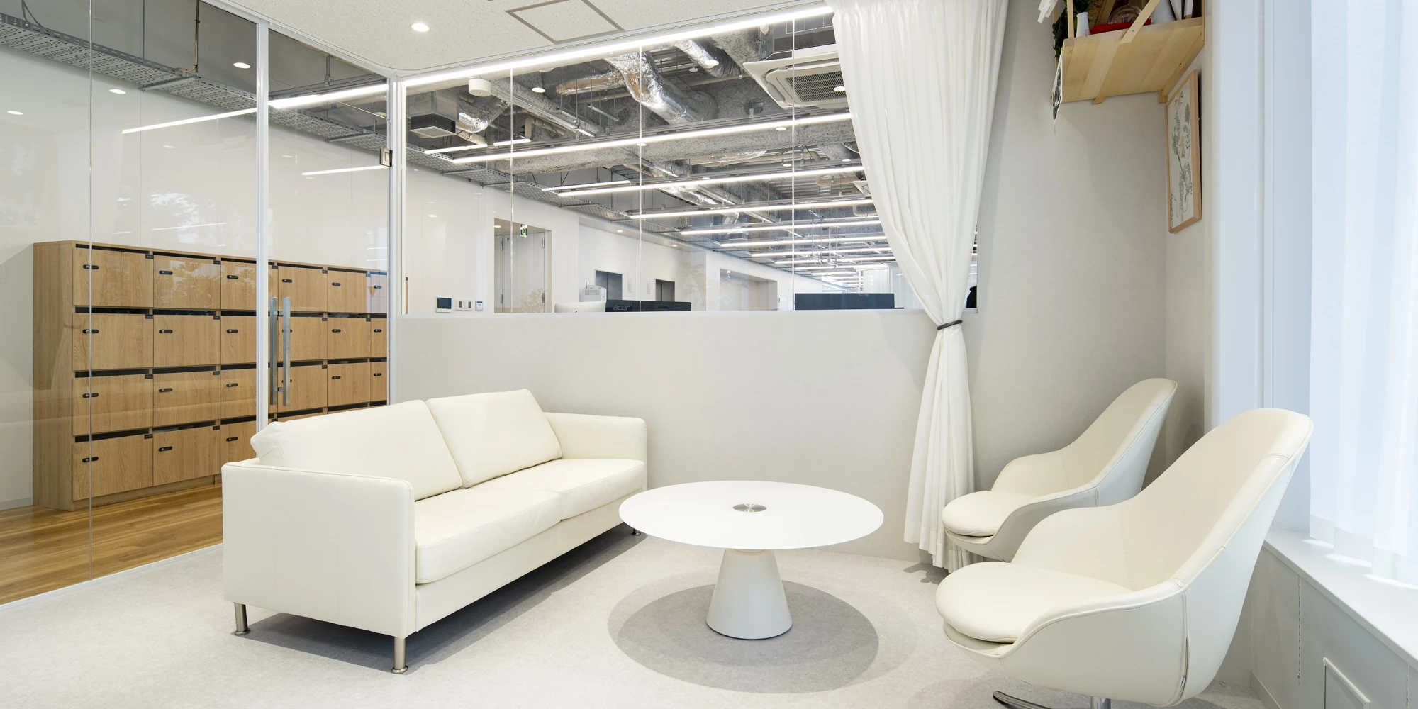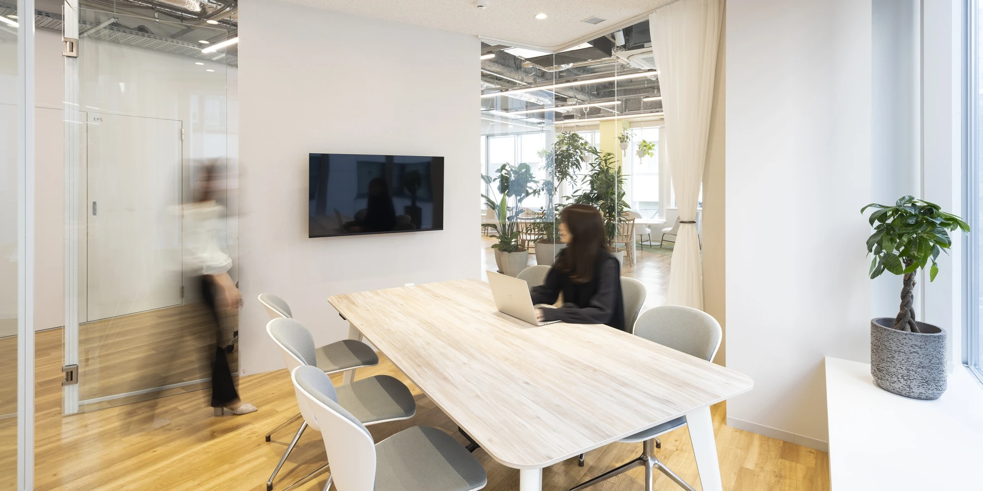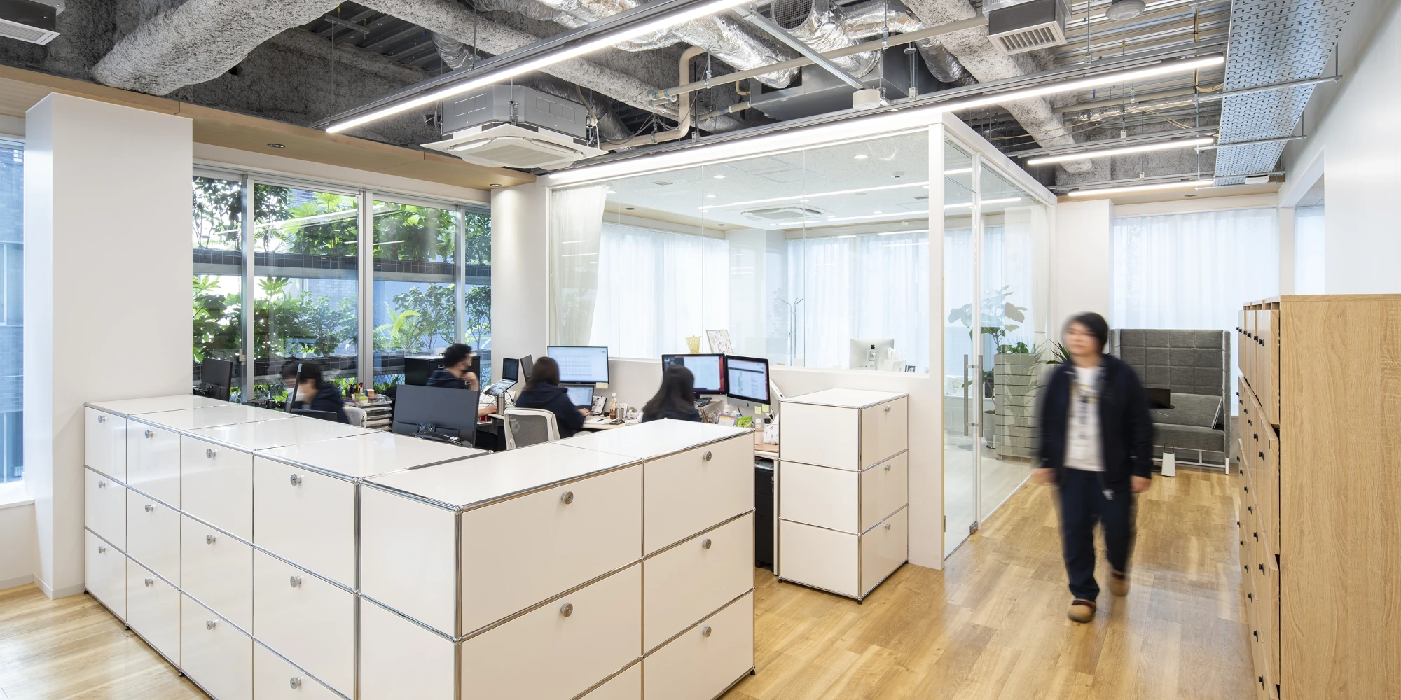 社員の過ごしやすさを最優先したいという代表者様の想いとともに移転プロジェクトがスタートしました。窓が多く、スケルトン天井での引き渡しという物件の特徴を活かし、社長室と会議室以外のエリア(エントランス、ワークスペース、リフレッシュスペース)は間仕切りを設けない開放的な設計としました。クリーンエネルギーを取り扱っている会社ということもあり、企業ブランディングのひとつとして、グリーンと木目のマテリアルやアースカラーを多く使用し、より自然を感じられるデザインになっています。ワークススペースは一部フリーアドレスを採用し、仕事内容や気分に合わせて席を選択できるABWを採用しています。「Raise(育てる、育む)」というコンセプトの通り、太陽と自然の下でのびのびとはたらくことができる空間となりました。