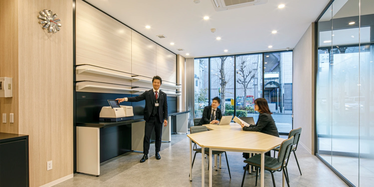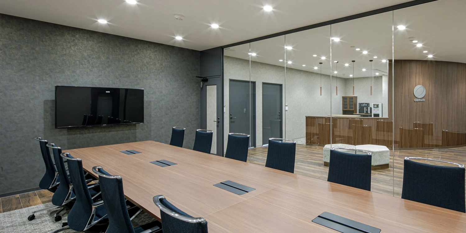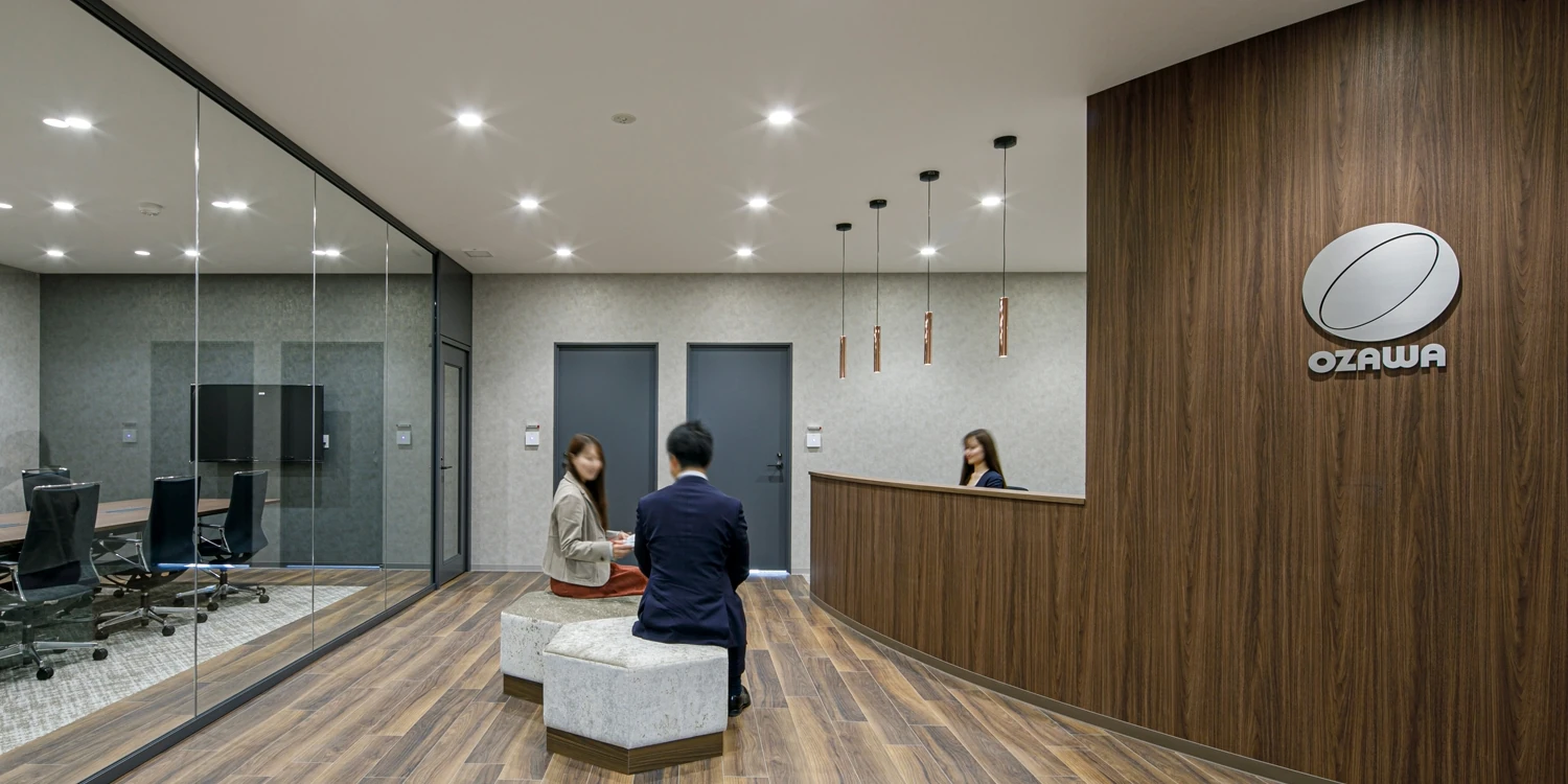 約2年に及ぶ本社ビル建て替えプロジェクトでした。1935年に創業、1946年から現地で営業しており、前回の本社ビル完成から53年ぶりのリニューアルとなりました。全体コンセプトは、培ってきた歴史を未来に繋ぐという思いをこめて、「BOND(繋ぐ)」としました。建築段階から6フロアに重なるビルの構想を重ね、来客エリア・多目的スペース・自社エリアとバリエーション豊かな構成となっています。2階はパートナー企業様も働いていただけるよう自由なレイアウトができる家具を選定し、3階は社員同士の交流が生まれるよう人の止まり木となる場所を点在させました。ホワイトを基調とした空間の中に、随所にコーポレートカラーのブルーを取り入れています。インパクトのあるアートは、2階にはこれまでの歴史のモチーフを、1階には未来へ向かうイメージのグラフィックを描き、80年を超える歴史あるオザワ科学様が未来に向かってイノベーションする様子を表現しました。人が集まり繋がることで未来を拓いていくオフィスとなりました。