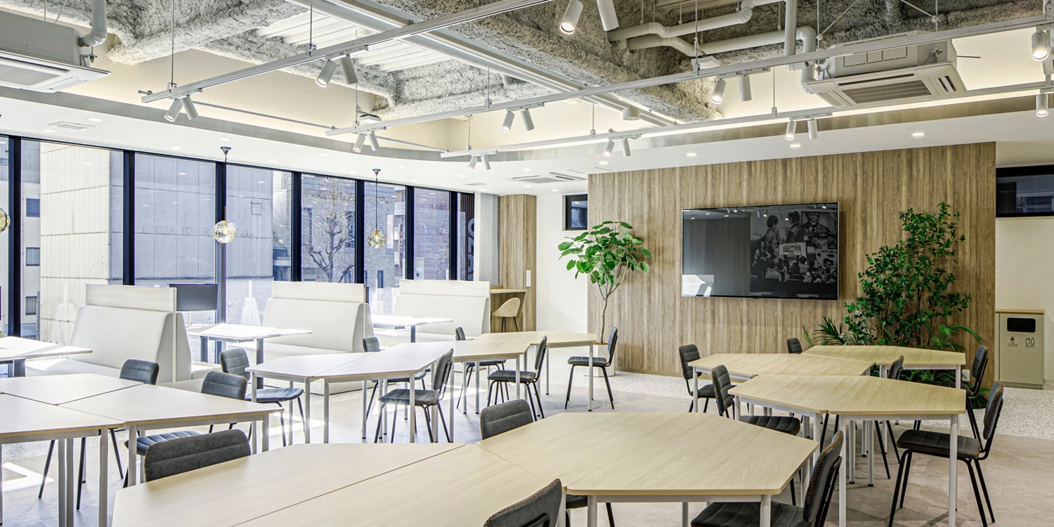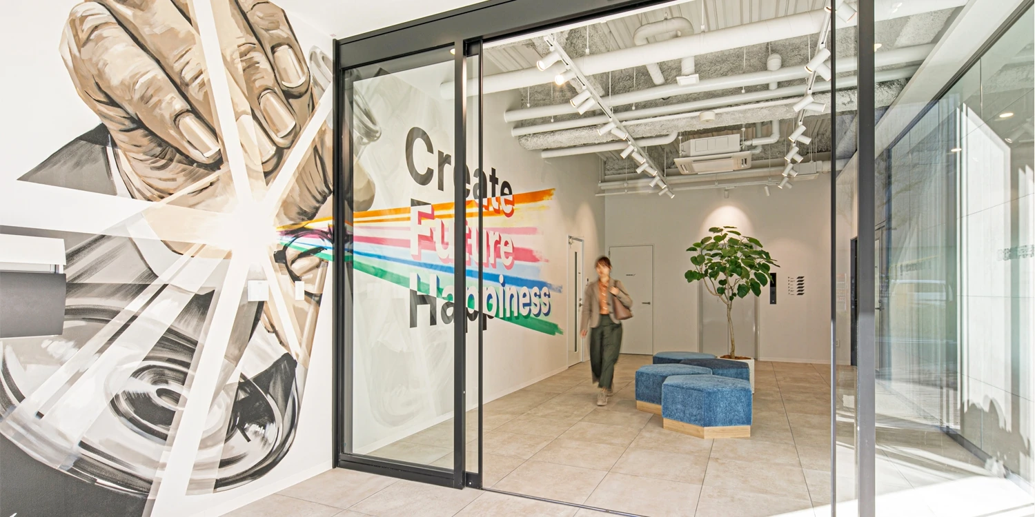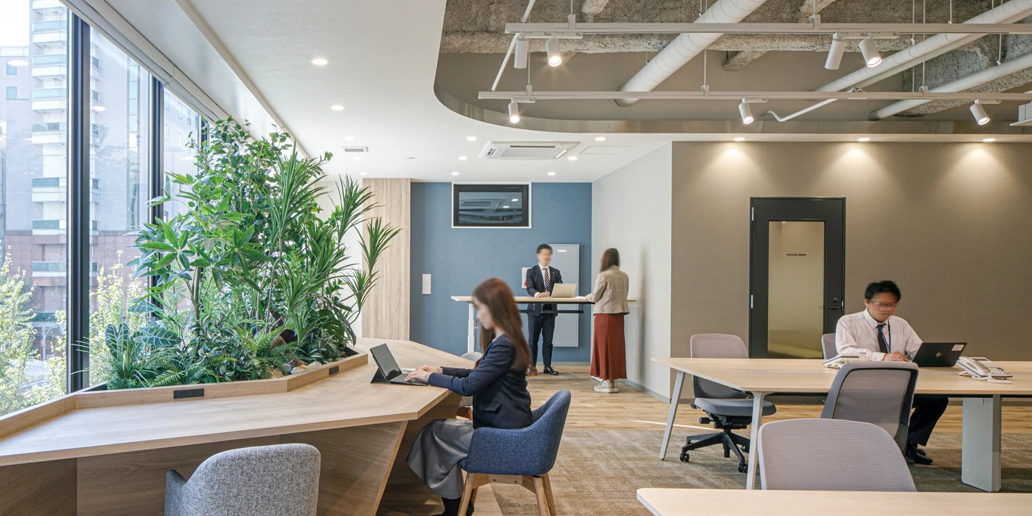 約2年に及ぶ本社ビル建て替えプロジェクトでした。1935年に創業、1946年から現地で営業しており、前回の本社ビル完成から53年ぶりのリニューアルとなりました。全体コンセプトは、培ってきた歴史を未来に繋ぐという思いをこめて、「BOND(繋ぐ)」としました。建築段階から6フロアに重なるビルの構想を重ね、来客エリア・多目的スペース・自社エリアとバリエーション豊かな構成となっています。2階はパートナー企業様も働いていただけるよう自由なレイアウトができる家具を選定し、3階は社員同士の交流が生まれるよう人の止まり木となる場所を点在させました。ホワイトを基調とした空間の中に、随所にコーポレートカラーのブルーを取り入れています。インパクトのあるアートは、2階にはこれまでの歴史のモチーフを、1階には未来へ向かうイメージのグラフィックを描き、80年を超える歴史あるオザワ科学様が未来に向かってイノベーションする様子を表現しました。人が集まり繋がることで未来を拓いていくオフィスとなりました。