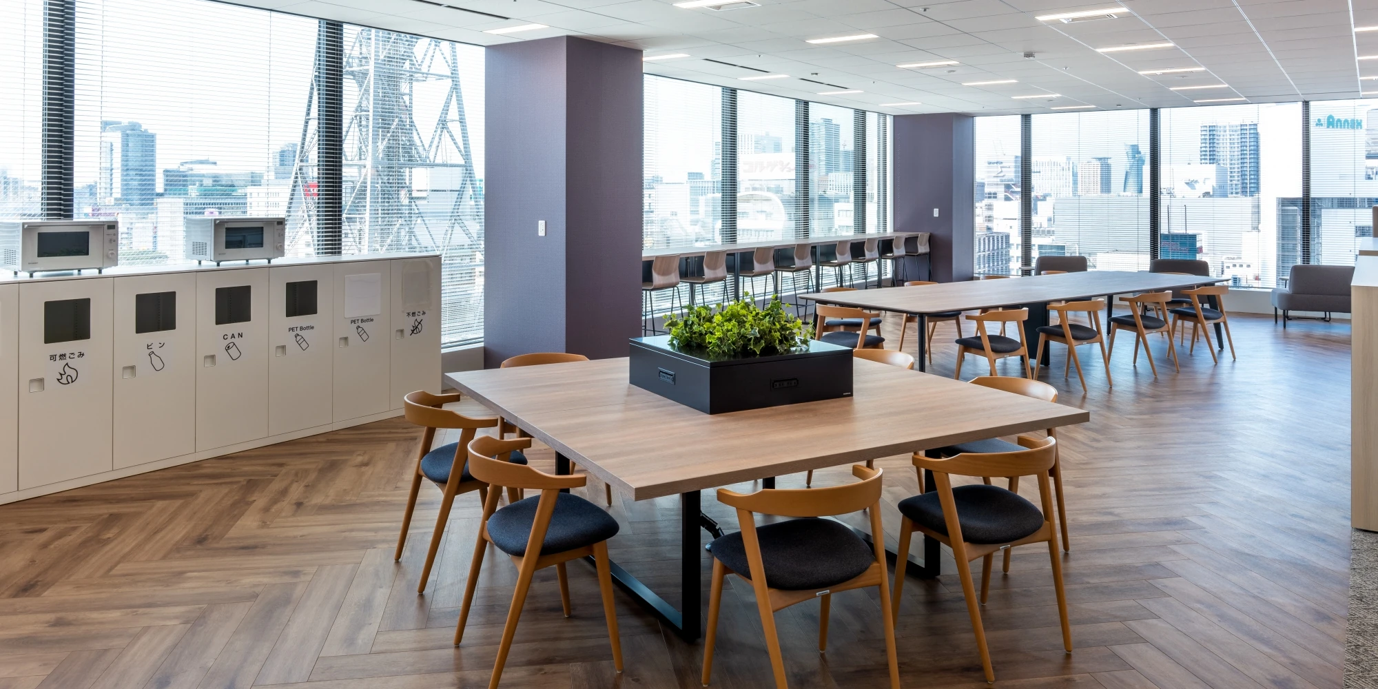 部署間および社員間の交流を促進するため、5フロアにまたがるワークエリアをすべてフリーアドレス化。各フロアにコミュニケーションエリア、集中エリア、リフレッシュエリアをレイアウトし、全席にサブモニターを設置することで、全フロアで業務内容に合ったはたらき方が可能な仕様としています。