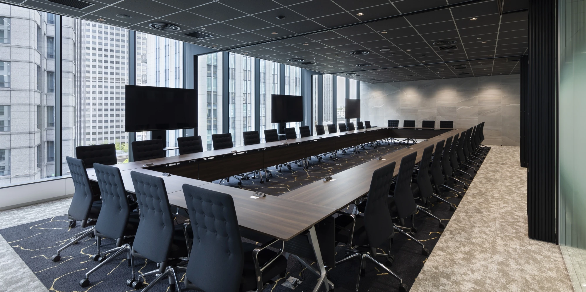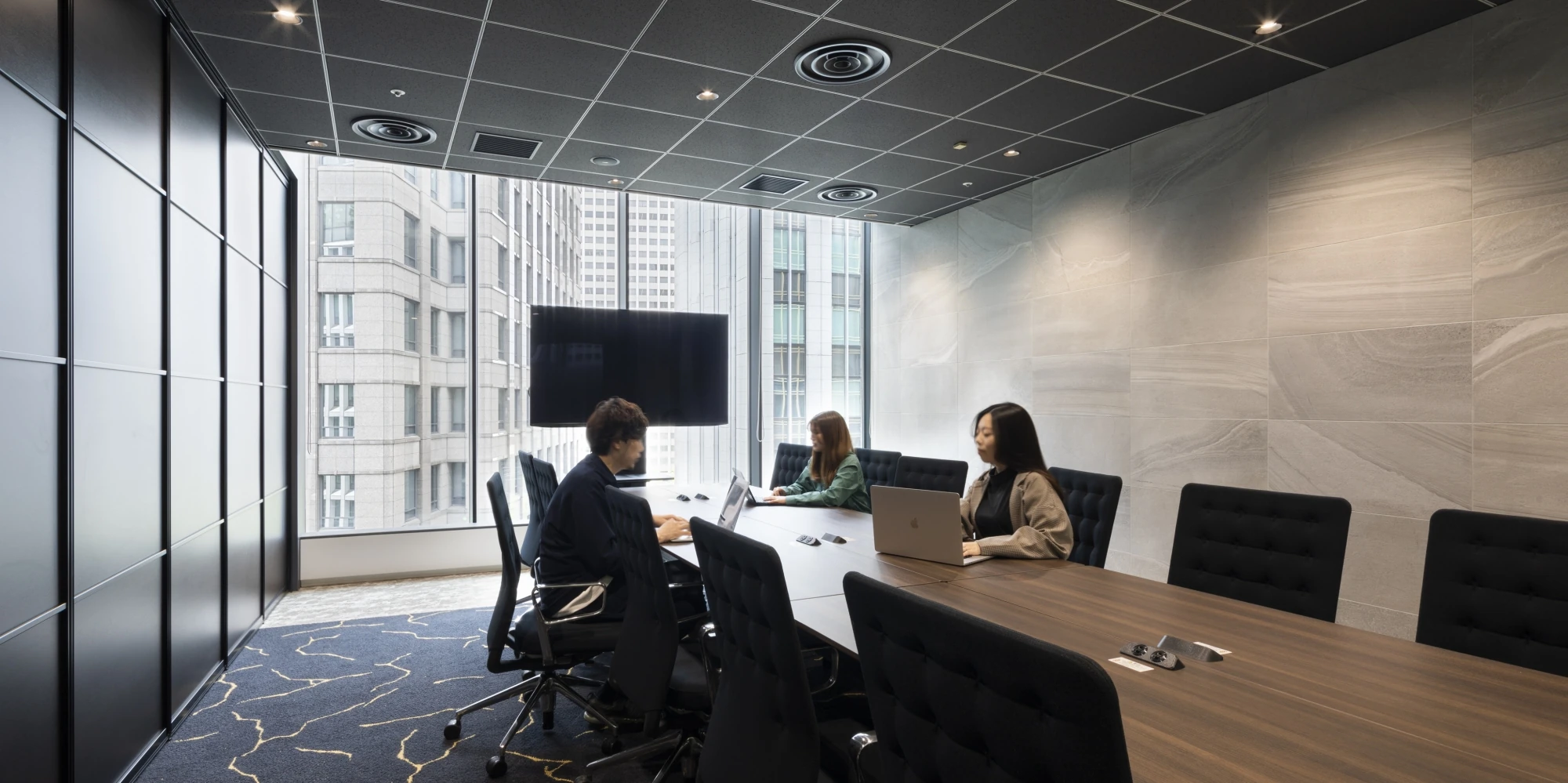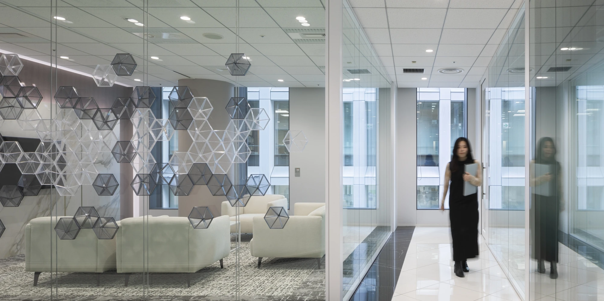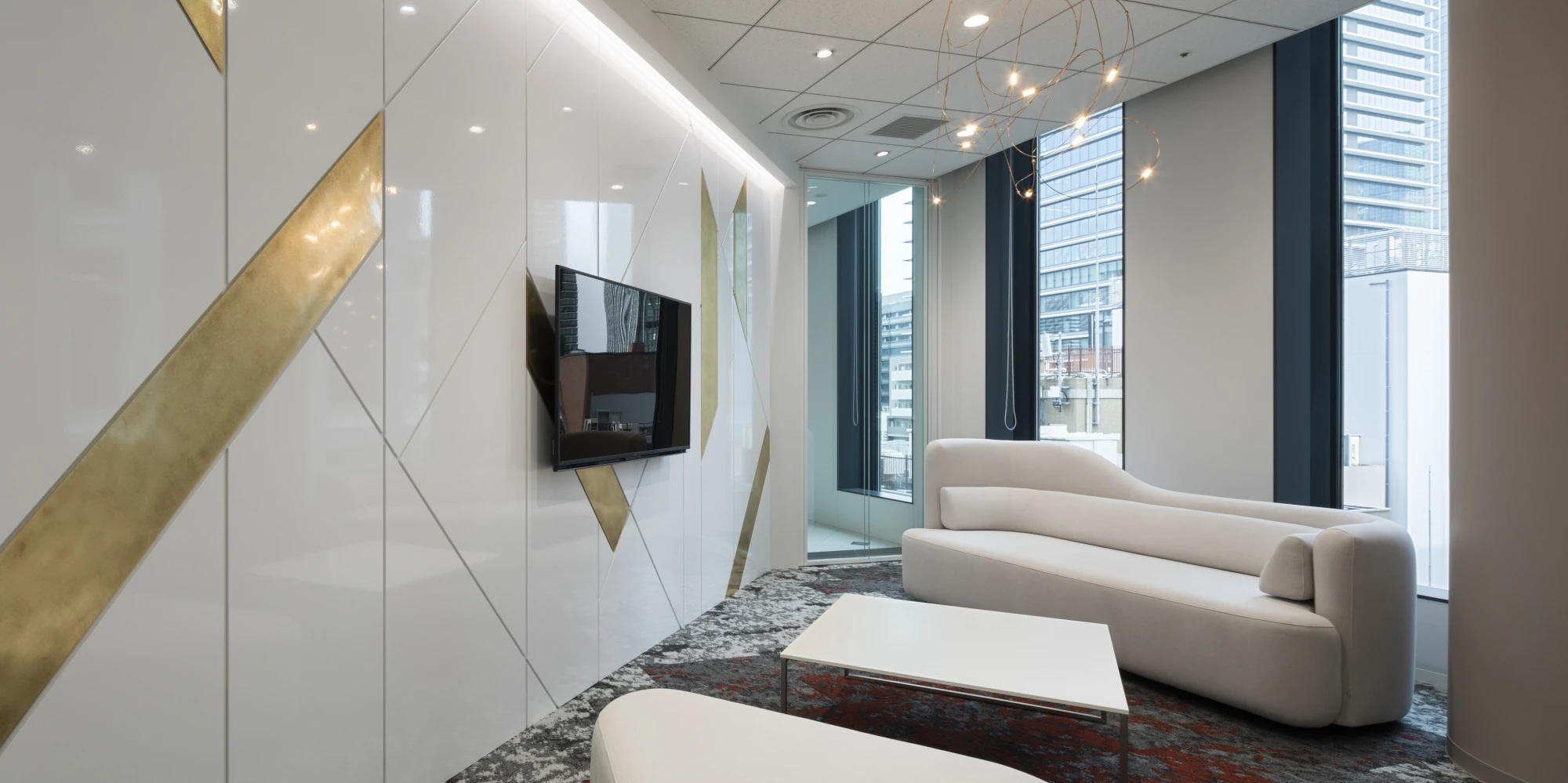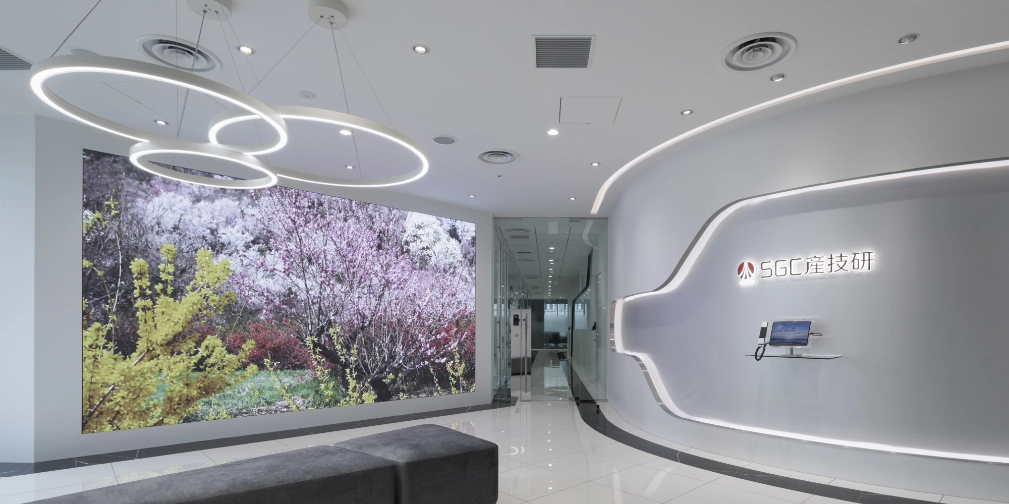 日本支店の開設プロジェクト。コンセプト「Liu(六)」のもと、「最先端」「高級感」を意識したデザインとしました。コンセプトの背景として以下の3つがあります。(1)事業に関連のある「炭素」の元素番号が6であること。(2)炭素は結合することでダイヤモンドになるなど「集まる」性質があり、採用で人を集めたいというオフィスの目的とリンクしていたこと。(3)本社のある中国では「6」は縁起の良い数字で、「このプロジェクトによって幸運が訪れますように」と想いを込めたこと。これらのコンセプトのもと、エントランスには大型LEDモニターを設置し、磁器タイルを使用して曲線の壁面や間接照明が印象的な空間に仕上げました。壁面のグラフィックはお客様の事業をイメージして制作したオリジナルのデザインとなっています。応接室は部屋ごとにデザインを変え、用途に合わせて利用することができます。応接室や会議室では、瞬時に色が変えられる瞬間調光フィルムや、防音効果のあるWガラスパーティション・サウンドマスキング・吸音パネルの設置、より快適に過ごすことができる調湿機能パネルなど、機能面にもこだわり内装材やインテリアを選定しました。