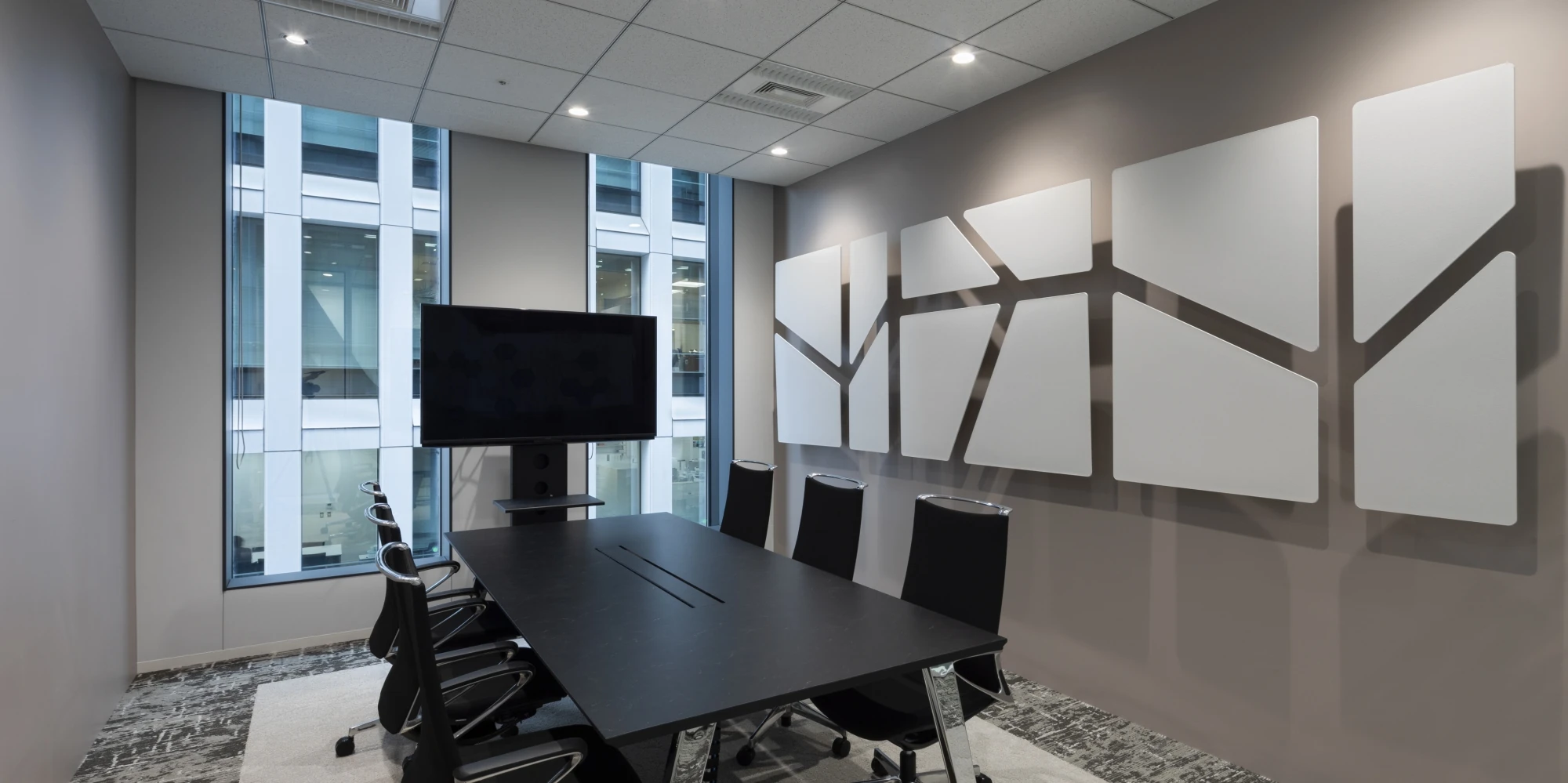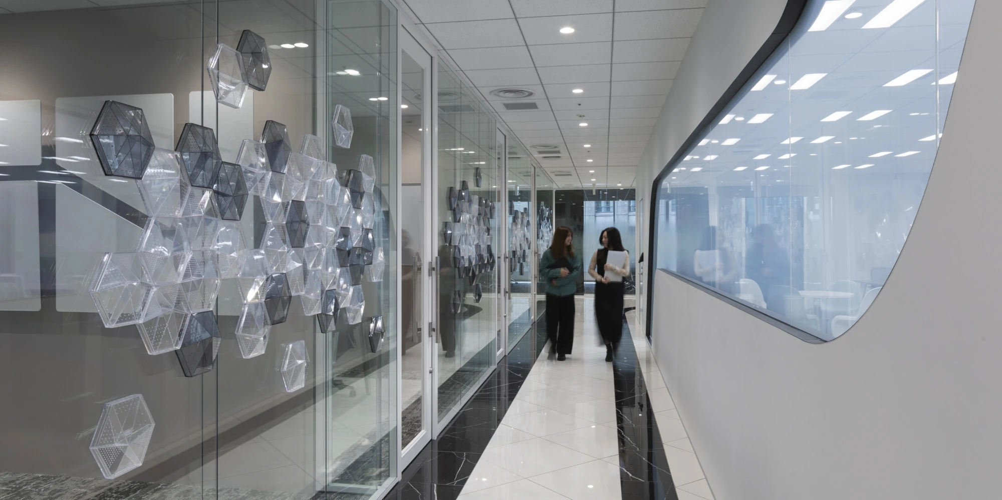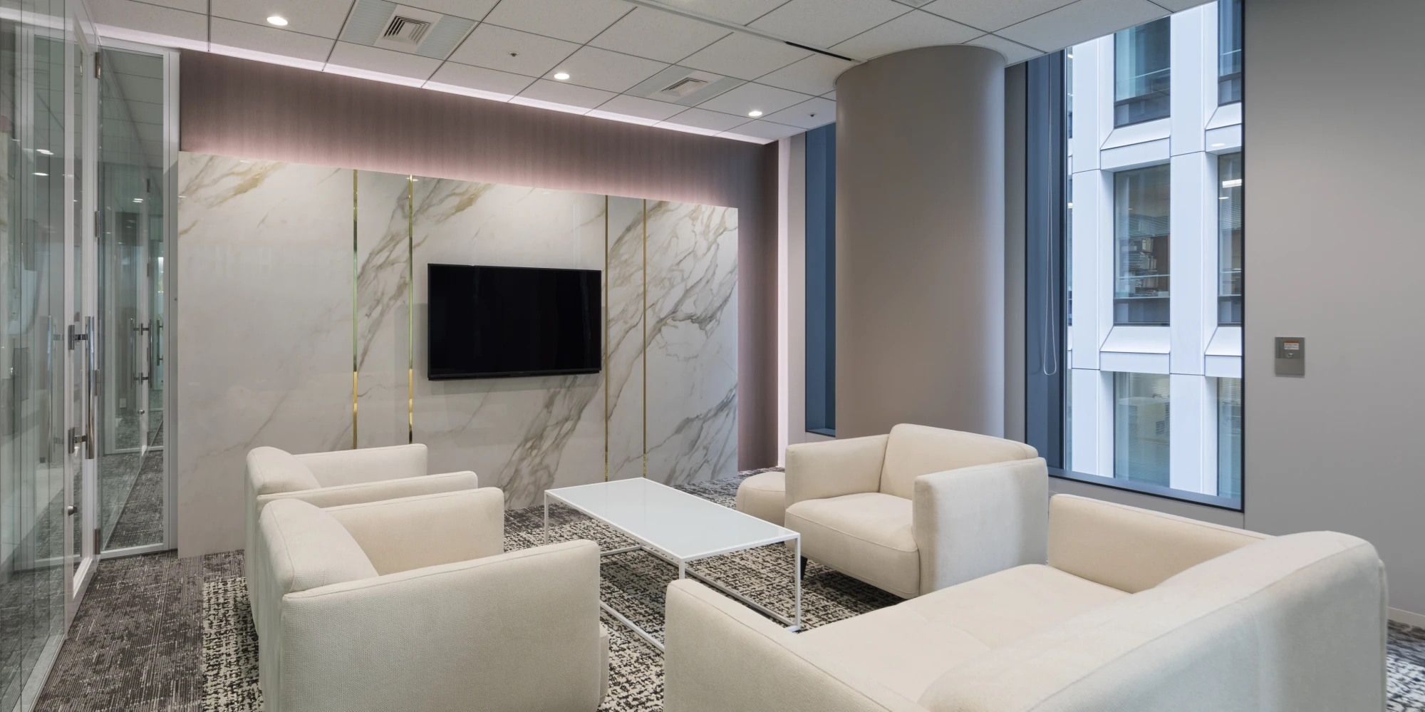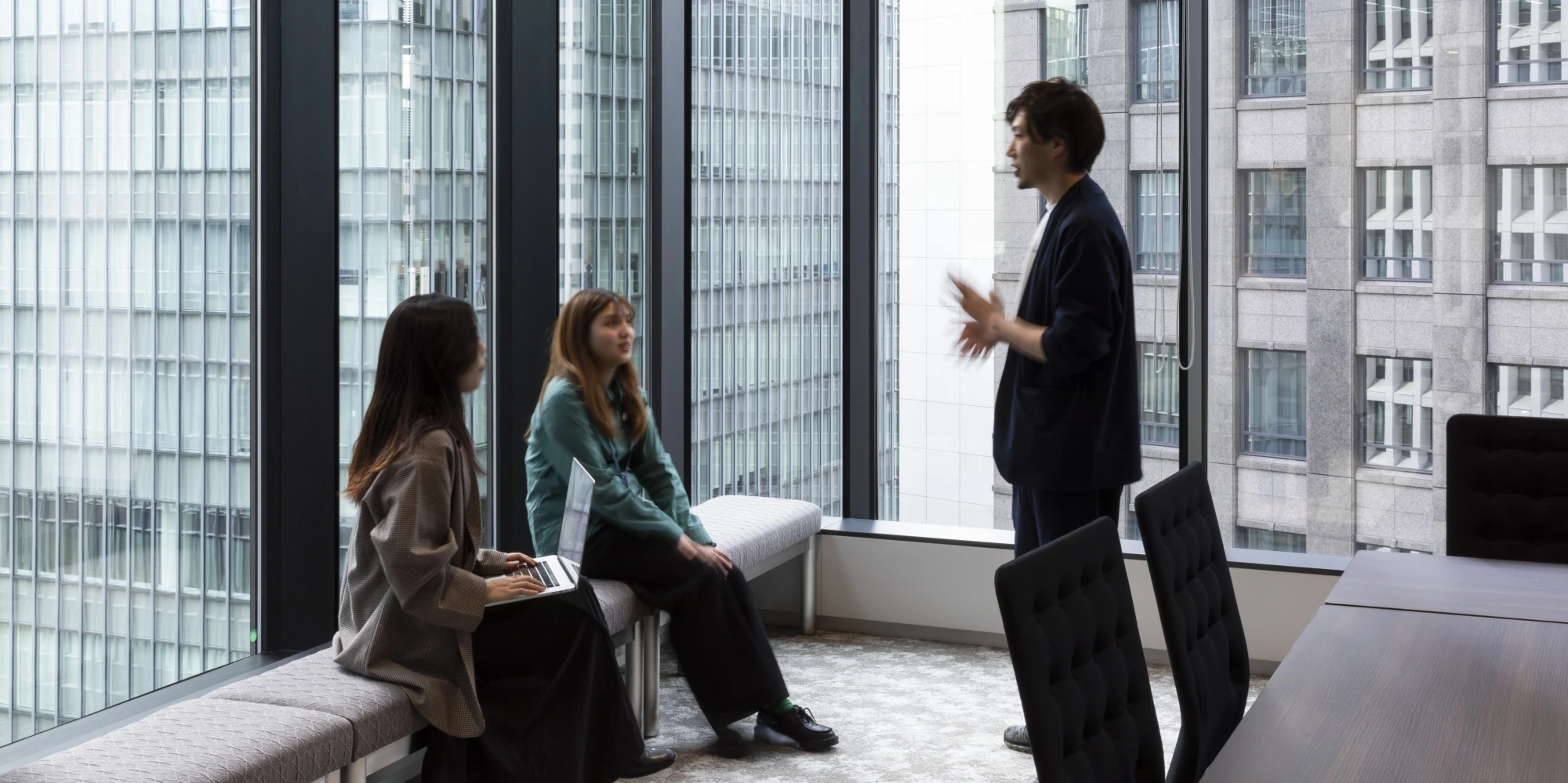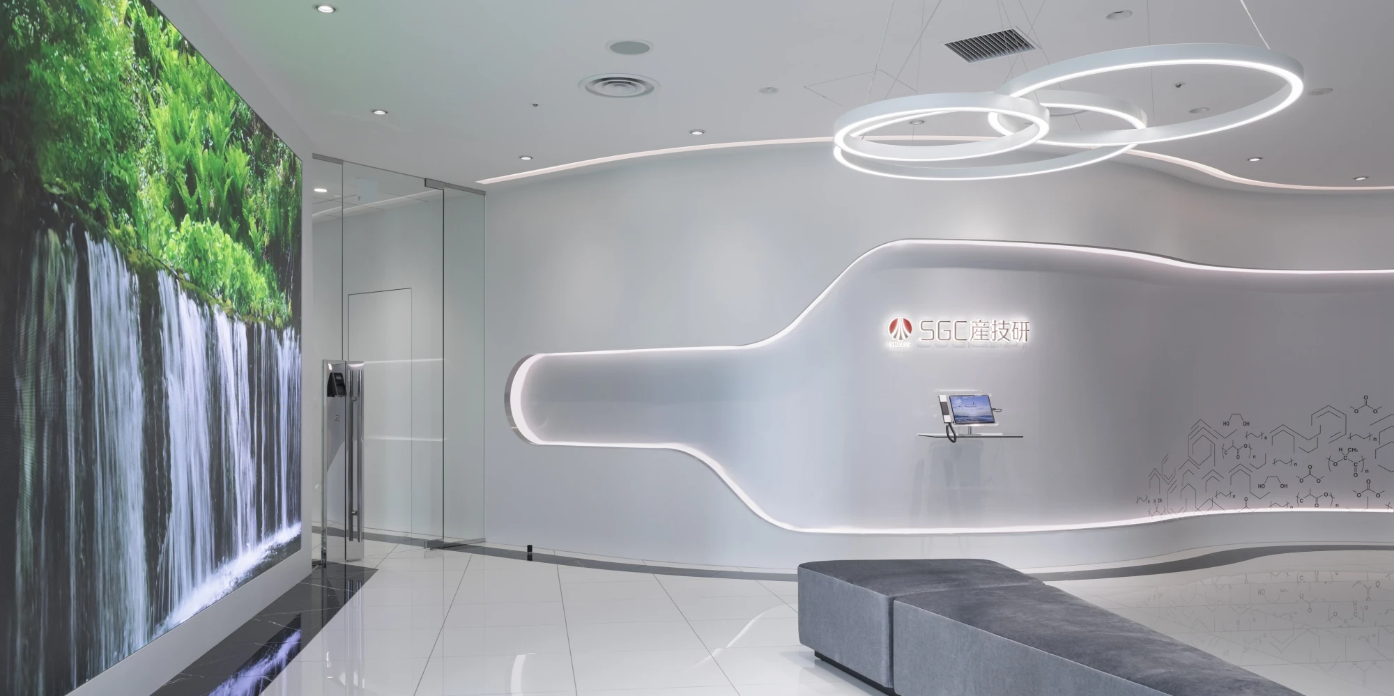 日本支店の開設プロジェクト。コンセプト「Liu(六)」のもと、「最先端」「高級感」を意識したデザインとしました。コンセプトの背景として以下の3つがあります。(1)事業に関連のある「炭素」の元素番号が6であること。(2)炭素は結合することでダイヤモンドになるなど「集まる」性質があり、採用で人を集めたいというオフィスの目的とリンクしていたこと。(3)本社のある中国では「6」は縁起の良い数字で、「このプロジェクトによって幸運が訪れますように」と想いを込めたこと。これらのコンセプトのもと、エントランスには大型LEDモニターを設置し、磁器タイルを使用して曲線の壁面や間接照明が印象的な空間に仕上げました。壁面のグラフィックはお客様の事業をイメージして制作したオリジナルのデザインとなっています。応接室は部屋ごとにデザインを変え、用途に合わせて利用することができます。応接室や会議室では、瞬時に色が変えられる瞬間調光フィルムや、防音効果のあるWガラスパーティション・サウンドマスキング・吸音パネルの設置、より快適に過ごすことができる調湿機能パネルなど、機能面にもこだわり内装材やインテリアを選定しました。