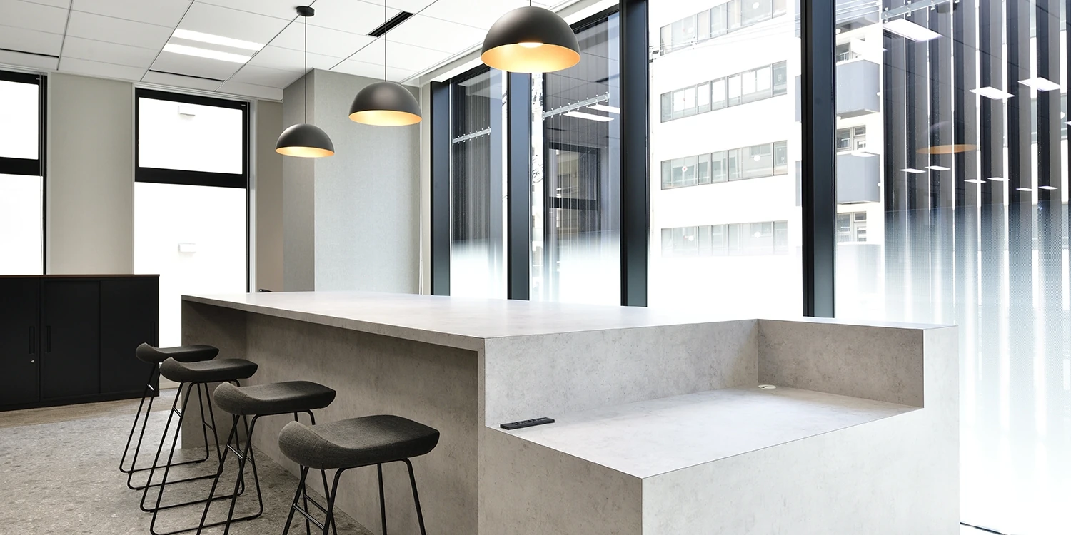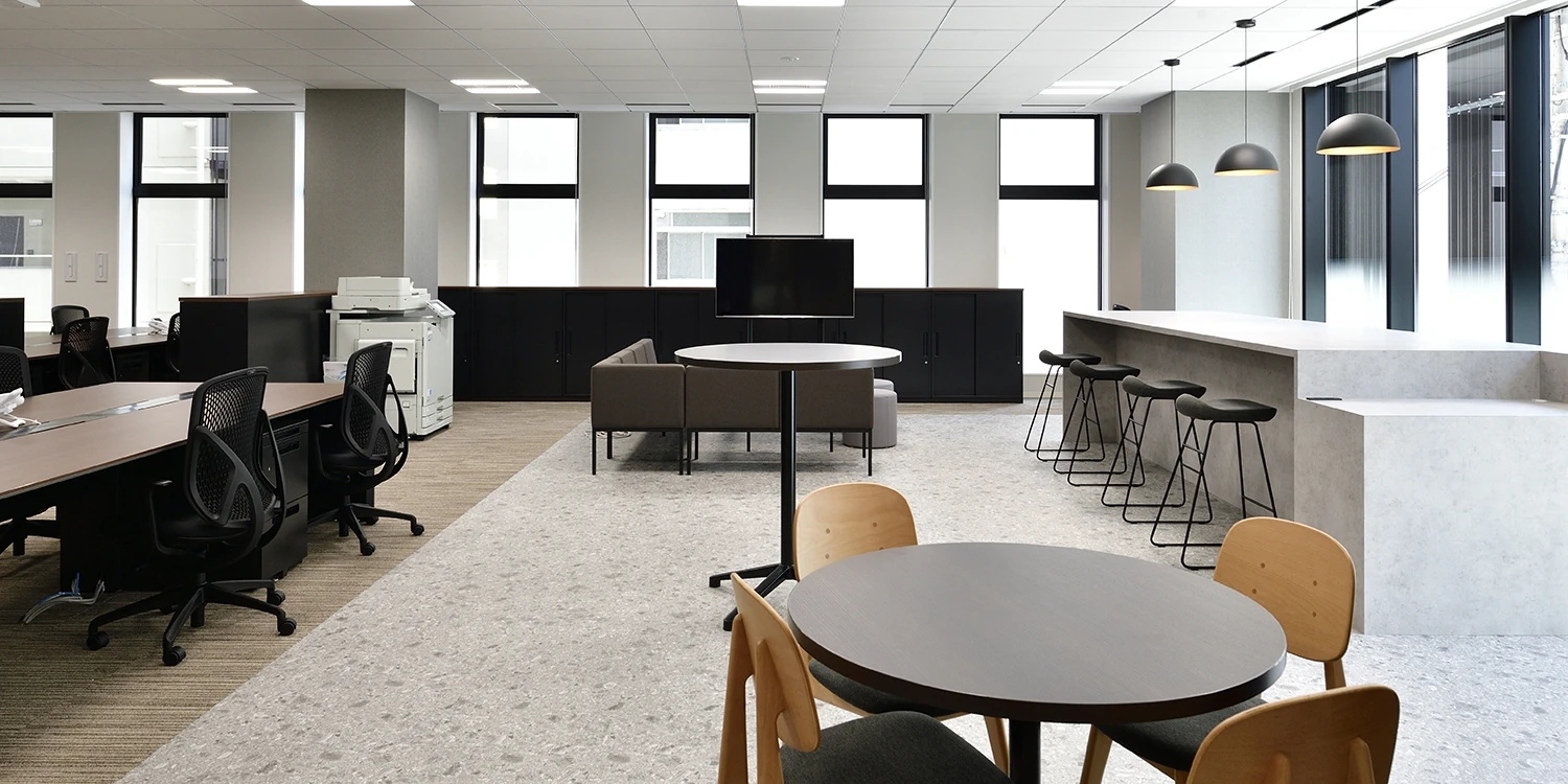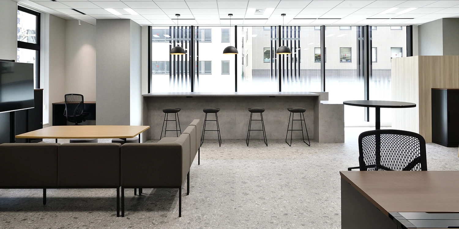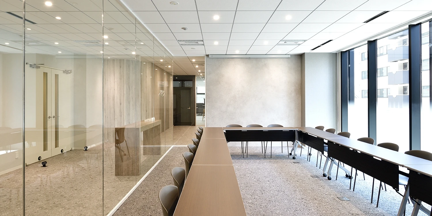 企業価値向上を目的としたVianode SHIN-OSAKAへのご移転プロジェクト。同ビル最大の特徴である入居者が共用で利用可能な1Fのビジネスラウンジを有効活用することも鑑みて、区画全体の設計を合理性を担保しながら無駄なくまとめました。若手社員の教育・フォロー制度が充実しており、社員を大切にするカルチャーが特徴の企業様であったため、はたらいている社員様の意見を積極的に取り入れてプランニングしています。ワークスペースとリフレッシュスペースの境界をあえて曖昧にすることで、社員の方が目的に応じてエリアを選べるようにレイアウトしました。塗装サービスを提供する企業アイデンティティーを表現するべく、エイジング塗装や木目のクロス、モルタル調の石目塩ビタイルを使用して工夫。一般的な塗装とはまた違った表情に仕上げ、塗装の可能性を感じられる空間をデザインしています。