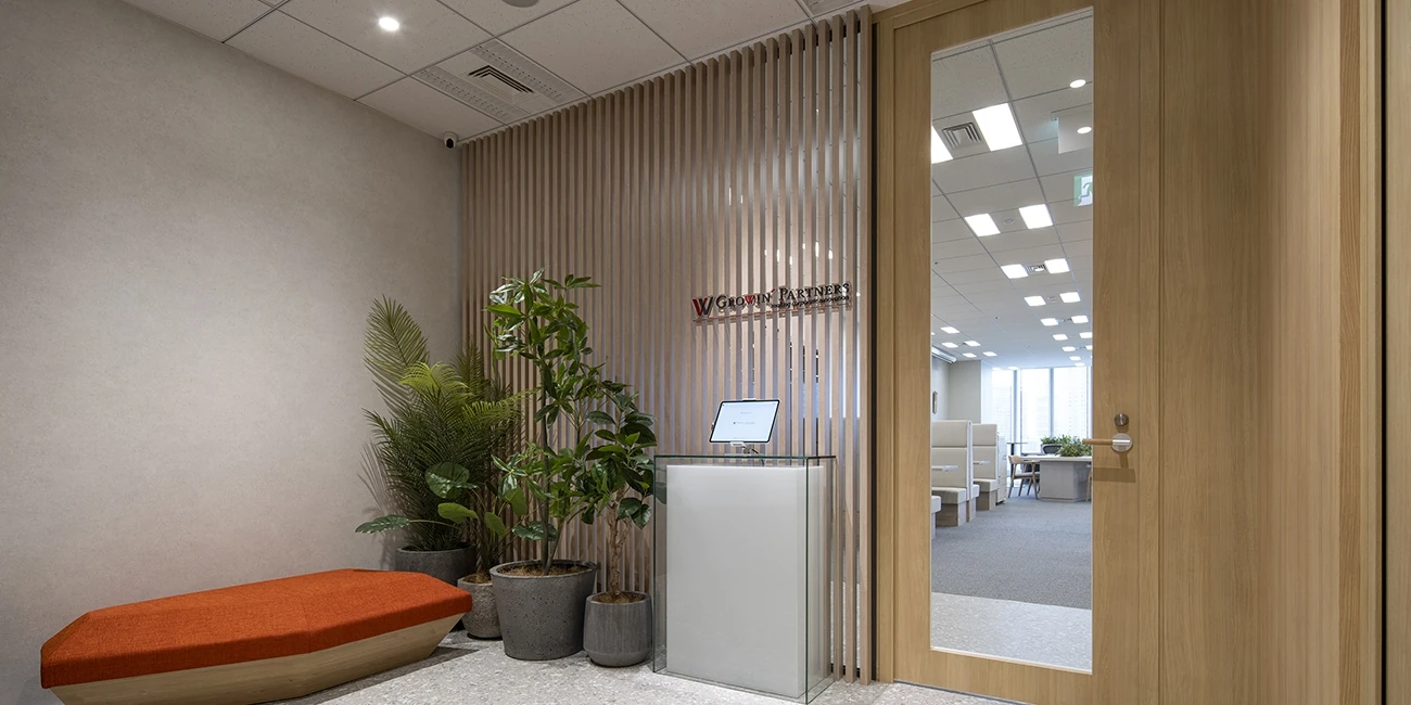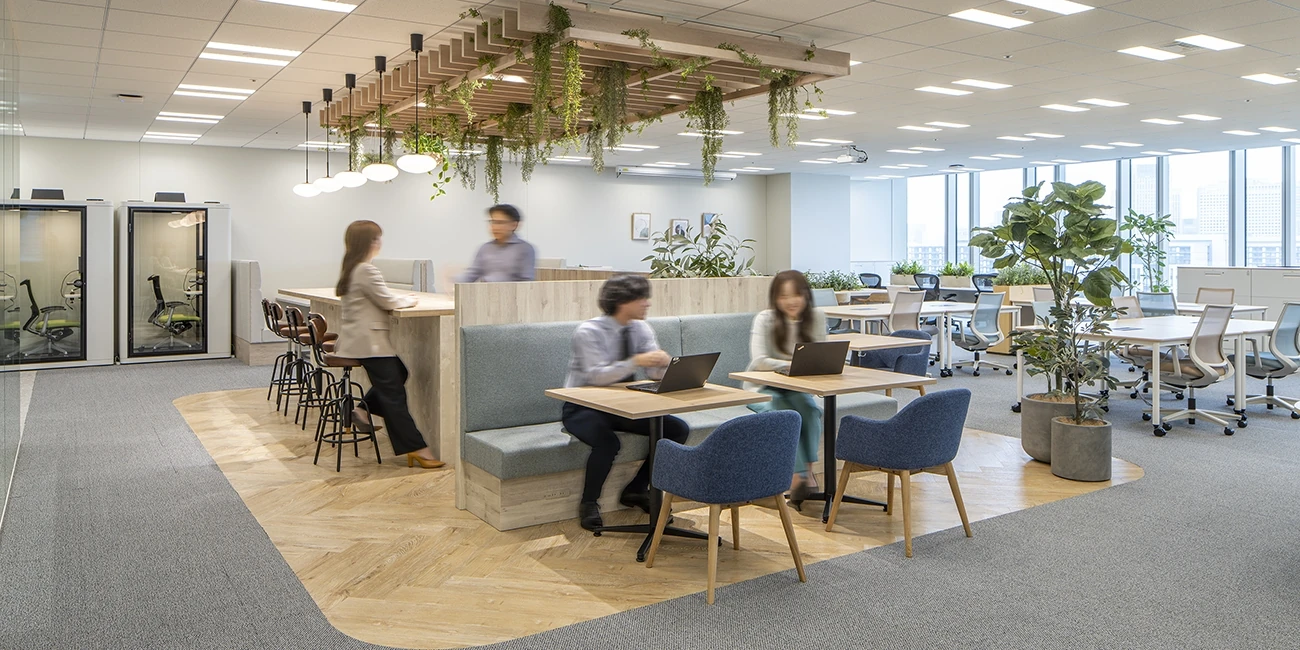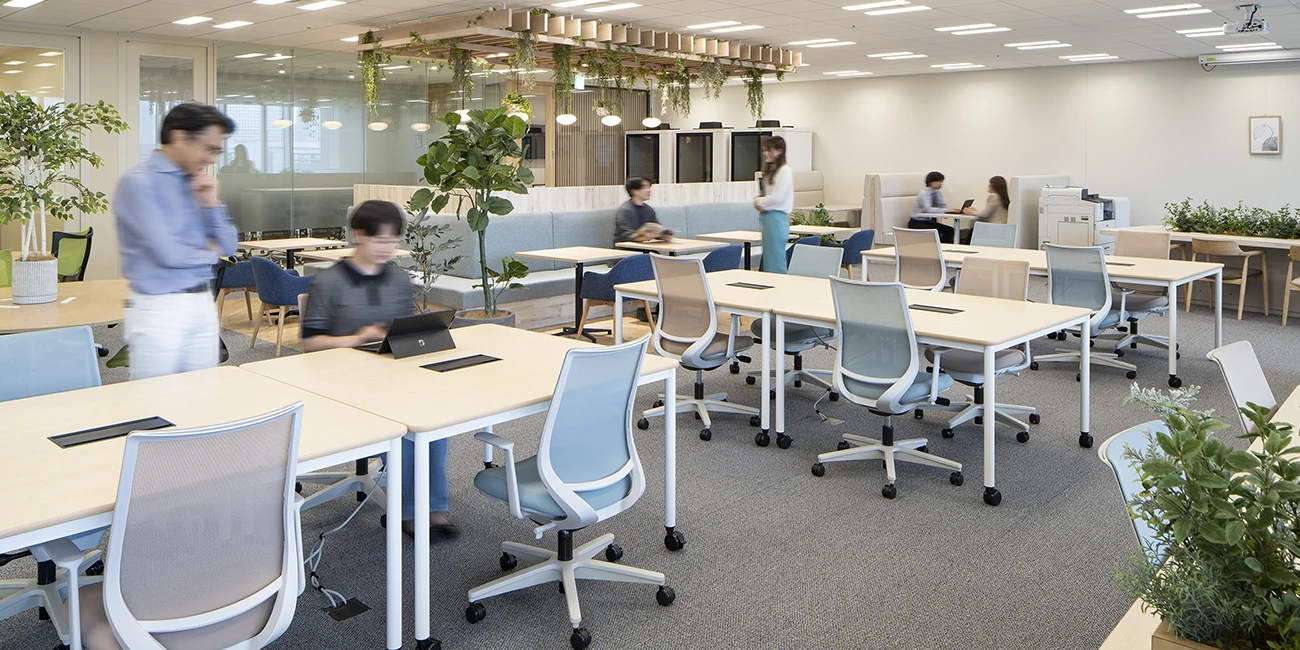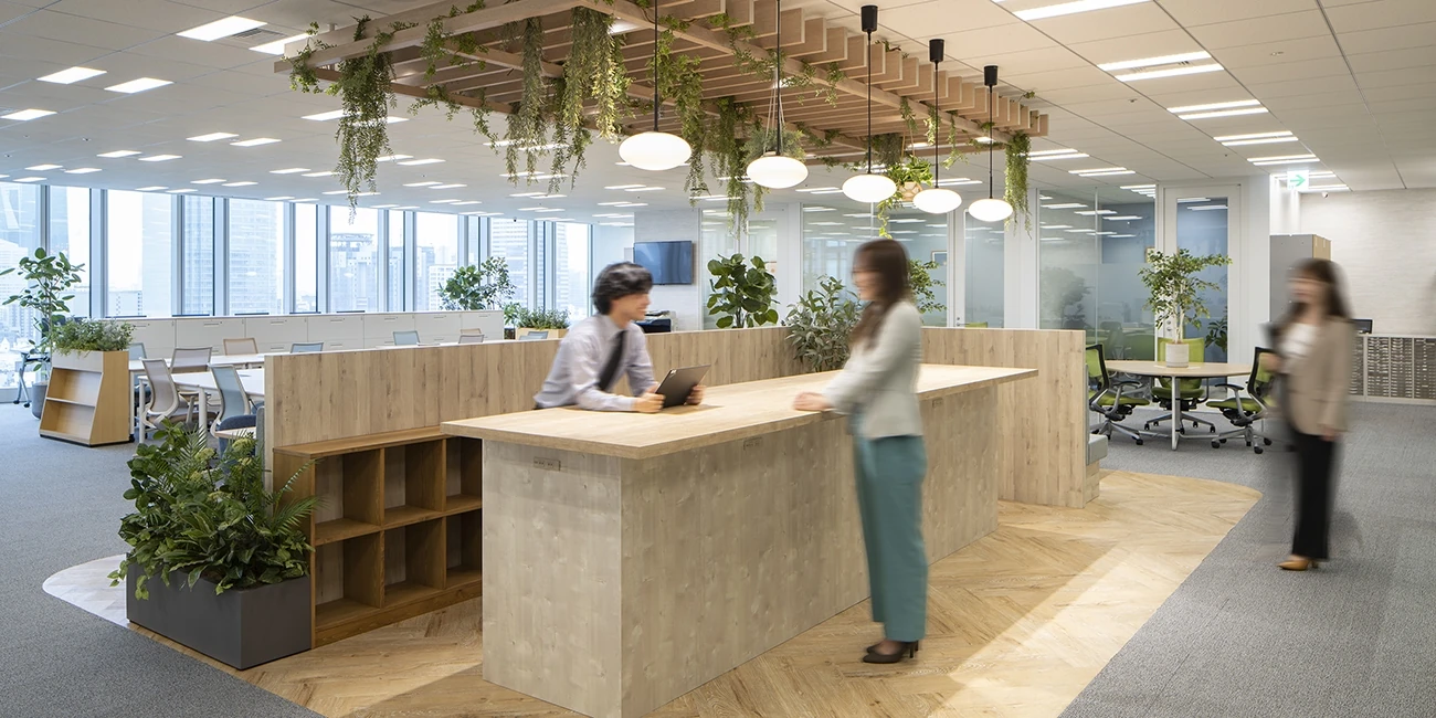 他部署とのコミュニケーション活性化を目的としたオフィス移転プロジェクト。ワークプレイスのコンセプト「結」の通り、社内外の人が自然に集まる仕組みを施しました。パントリーカウンターを執務室中央に設けてコミュニケーションの拠点となるマグネットスペースとし、印象的なルーバー天井を設置。社外の方がエントランスからも見えるように設計しています。フリーアドレスを採用して可変的なレイアウトとし、自らはたらく場所を選べるようにしました。全体のインテリアは、自然をイメージとした印象に。木目やブルーなどのカラーを用いて海や砂浜を表現し、自然光を存分に活かすことで、明るい雰囲気のオフィスに仕上げています。