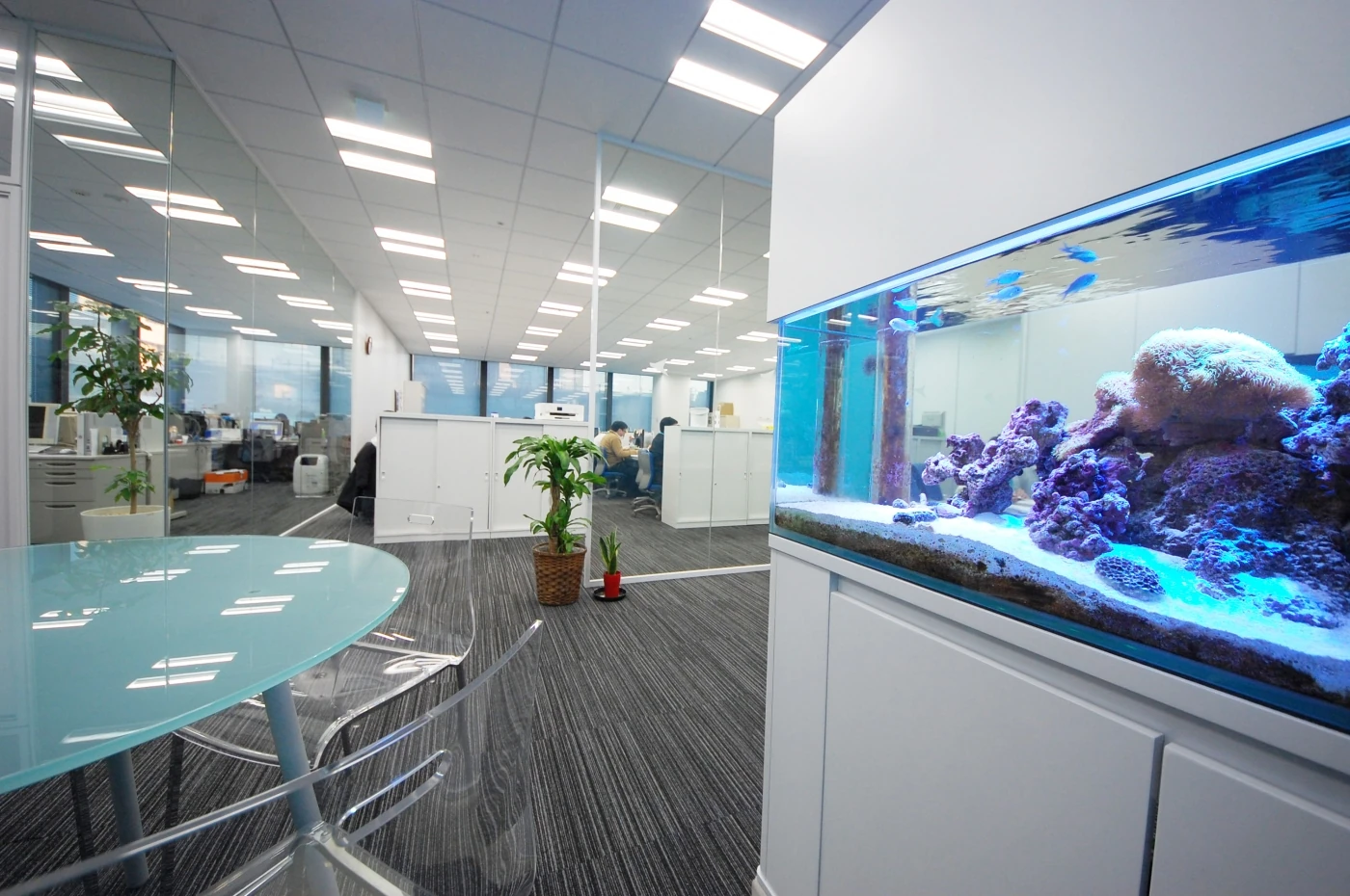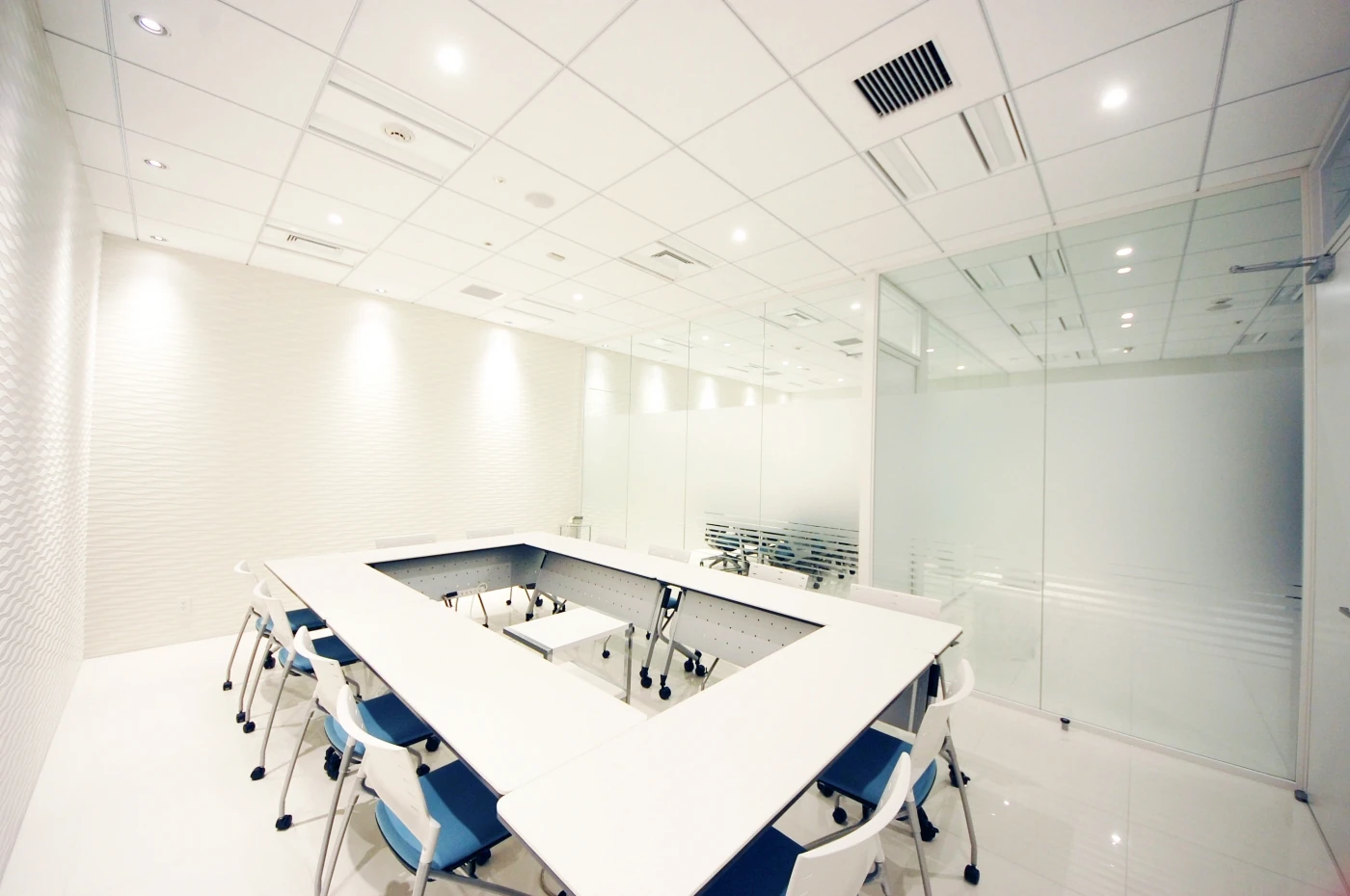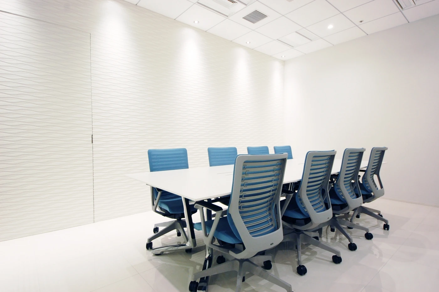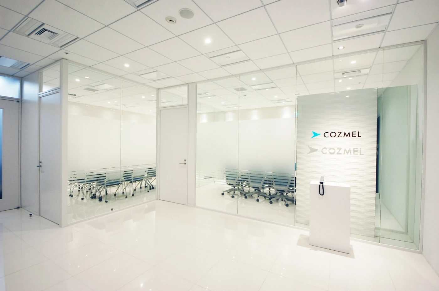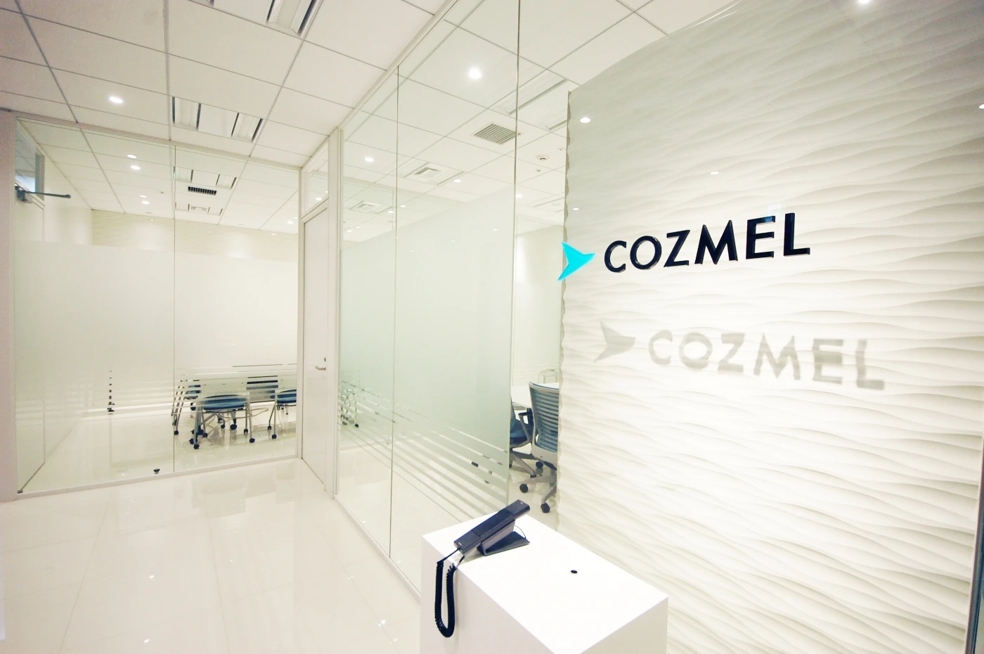 コスメル様の社名の由来は、カリブ海に浮かぶコスメル島。その海は透明度が高く「コスメルブルー」と呼ばれています。オフィスの随所に用いられたガラス、磁器タイルの透明感がコスメルの美しい海を連想させ、波をイメージした流れるような壁の加工は空間にアクセントを与えています。穏やかな白いエントランス、会議室エリアはご来訪の方へ信頼感を与え、コスメル様の透明度の高いクリアな経営がデザインされています。
