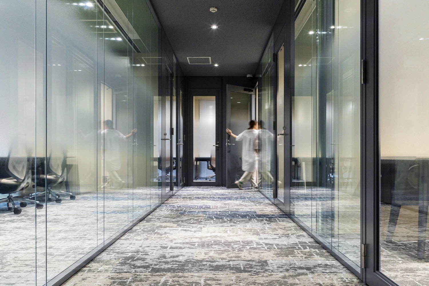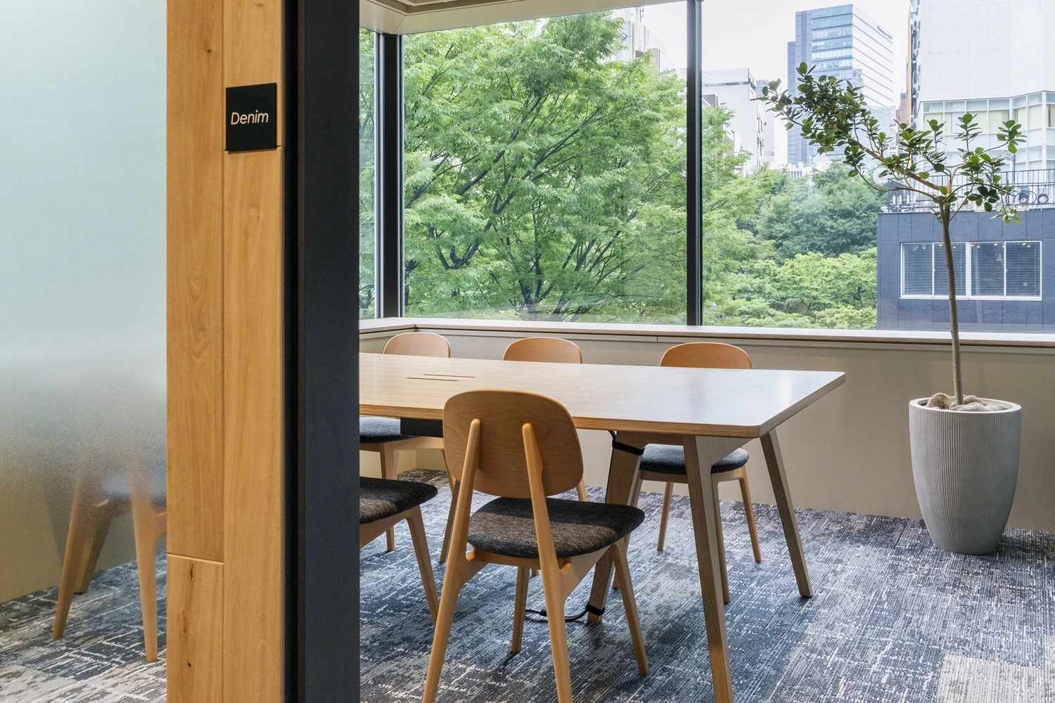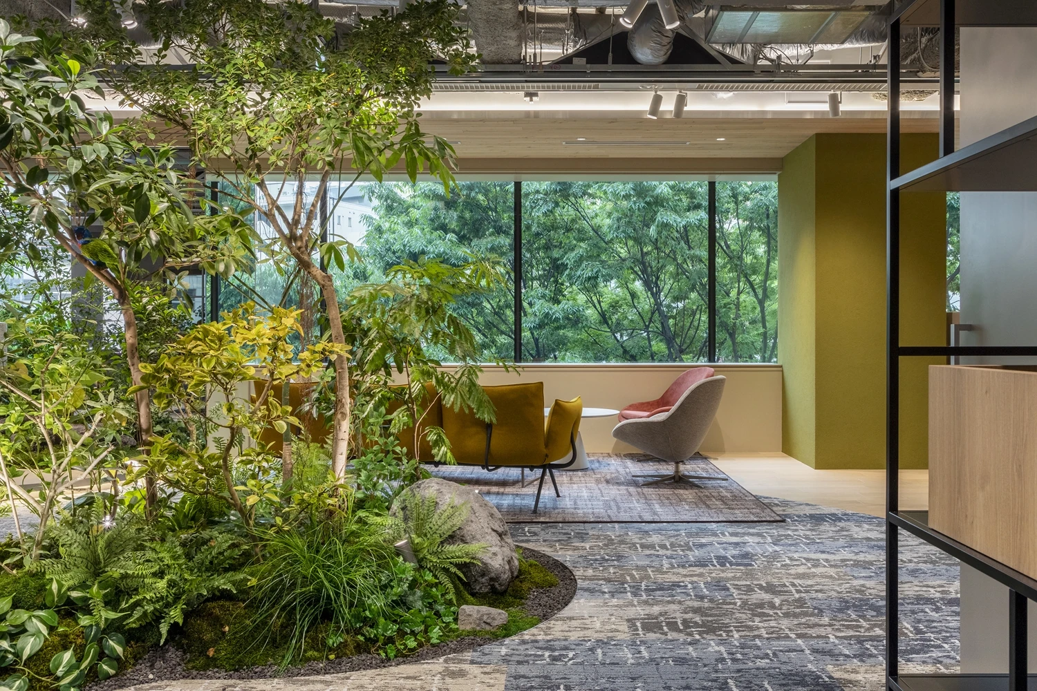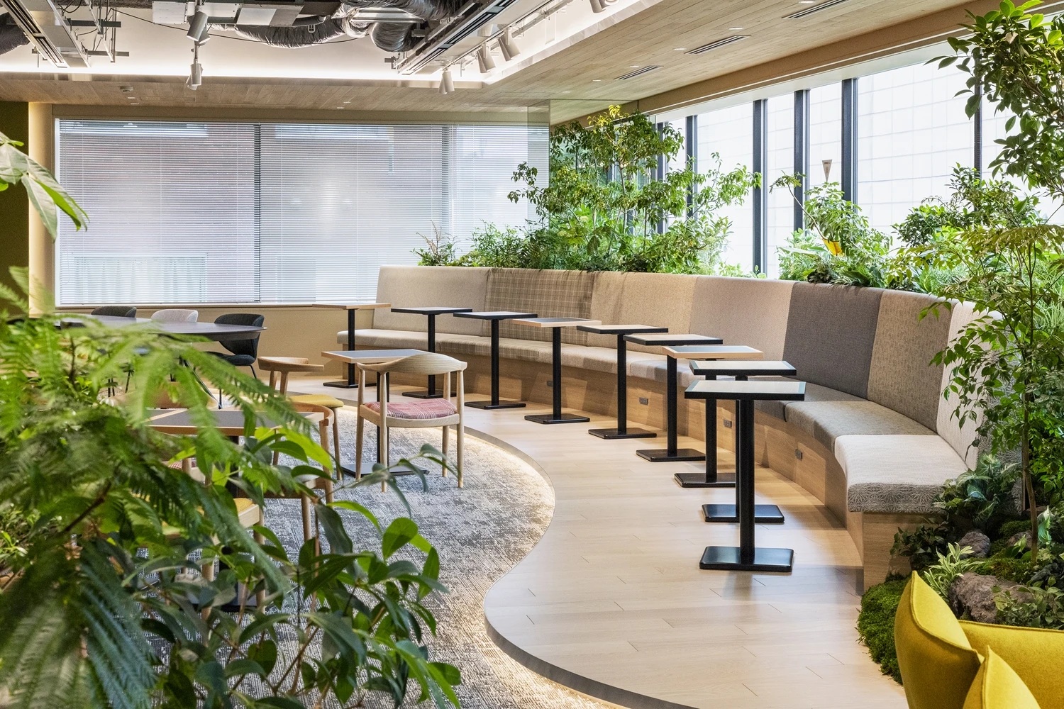 ヴィスが運営するシェアオフィス「The Place」。心斎橋、名古屋に続く3拠点目を、多くのスタートアップ企業が事業を展開する渋谷に開設しました。コンセプトは「TSUMUGI」。人と人の交流を促し新たな価値やビジネスが生まれる空間を設計しています。入居企業が利用できる共有ワークエリアは、仕事内容や気分に合わせてはたらく場所を選ぶことができます。集中スペースやリラックススペース、コミュニケーションスペースなど、さまざまなはたらくシーンに対応する場所をレイアウトしています。また、可変的なレイアウトと大型LEDモニターを設けたことで約50名規模のイベントを開催でき、人同士、企業同士の交流を促します。インテリアは、シックで洗練された印象に仕上げて統一感を。ラウンジの扉を開くと印象的なグリーンが来訪者を迎え、窓から入る採光が開放感を演出します。シェアオフィスの各個室にはワークデスクとワークチェア、個別空調を設け、利用者に少しでも快適にはたらいていただける環境をデザインしました。