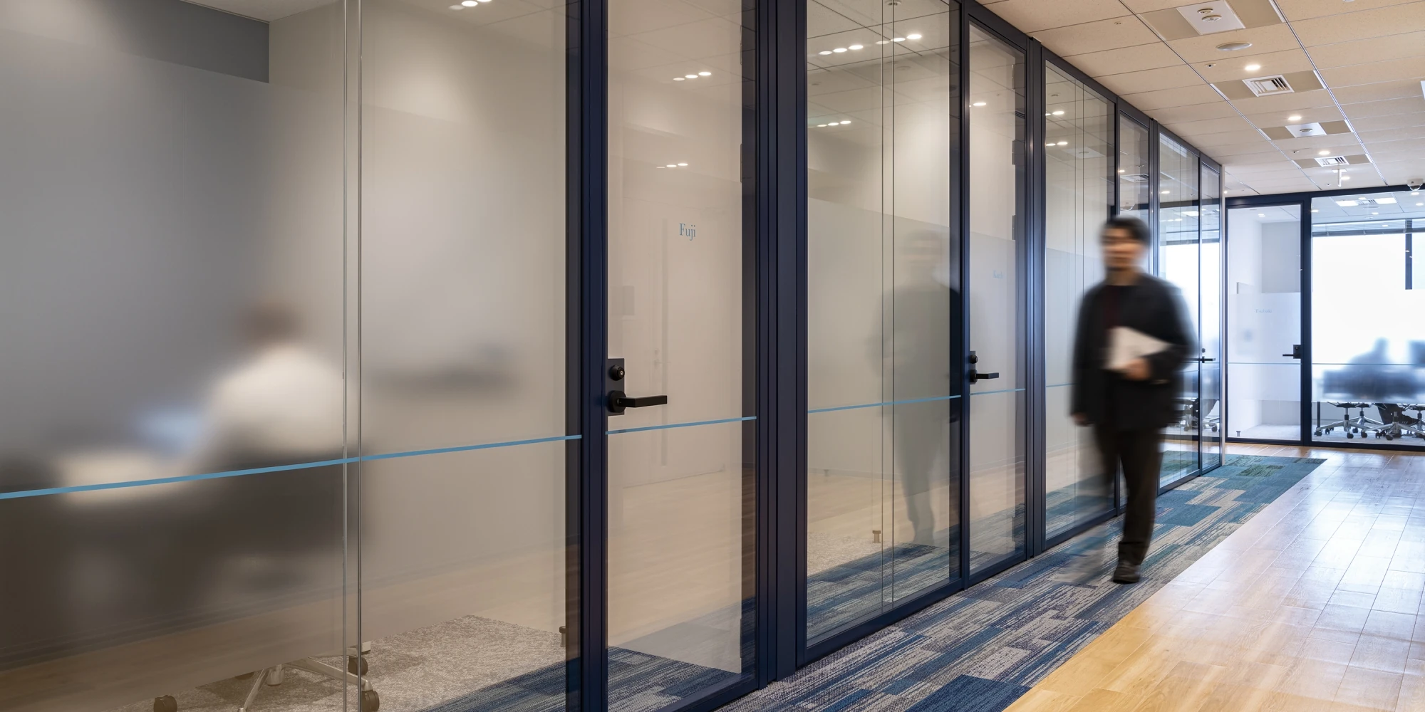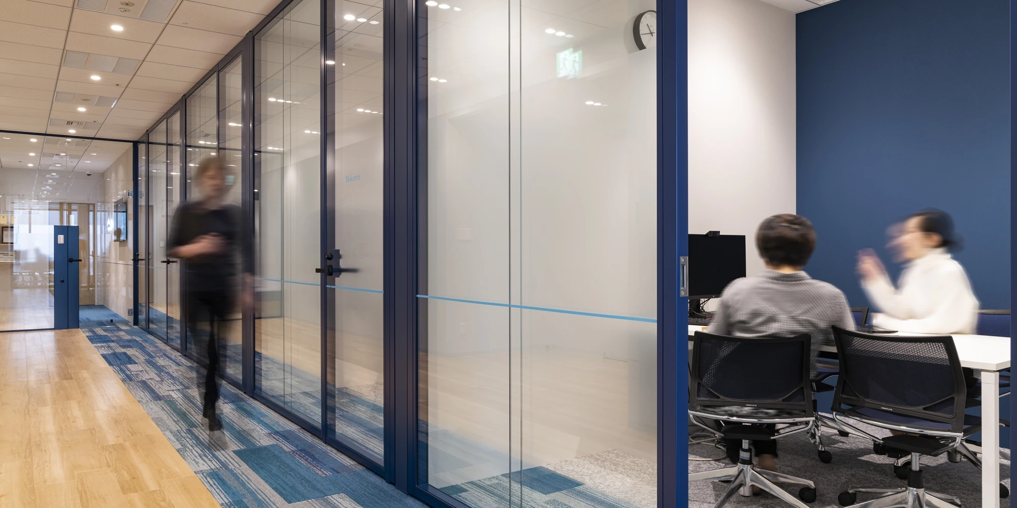 窓際ベンチスペースや個室ブース、コミュニケーション活性化を意図したカフェテリアなど、多様なシーンに対応する機能をレイアウトしています。カフェ空間は、イベントでの盛り上がりに相応しい空間とするため、複数の色を取り入れ彩りある印象に仕上げています。また、コーポレートカラーのブルーを随所に取り入れたことで、視覚的にブランド意識が高まる空間になりました。