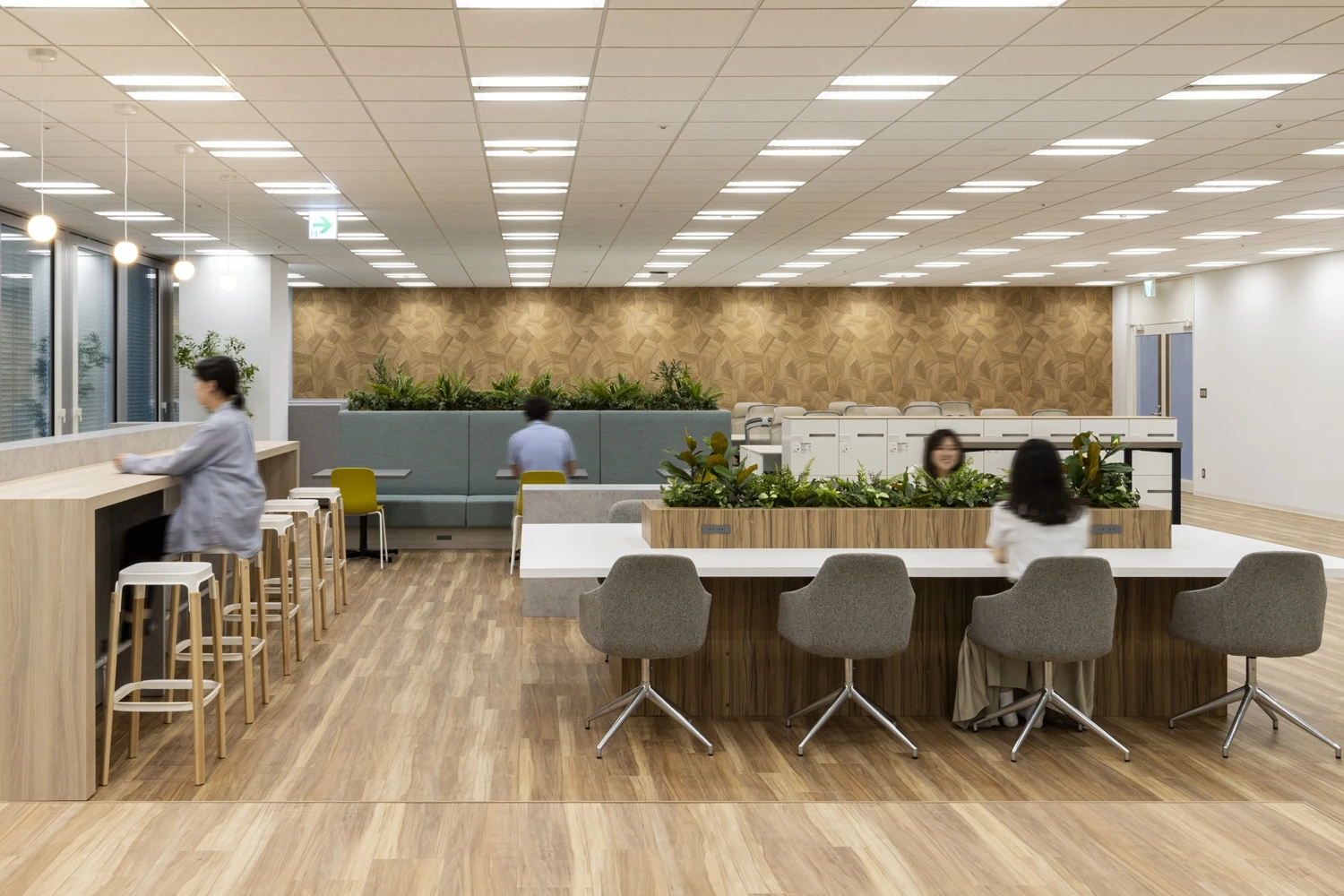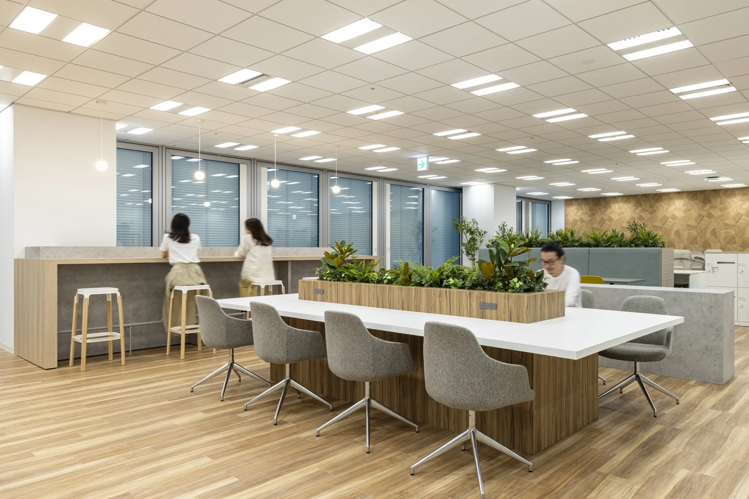 シェアオフィスから初めての自社オフィスへのご移転プロジェクト。社員同士のコミュニケーションやイノベーションがより多く生まれるオフィスを目指しました。テレワークを積極的に行っている企業様であるため、ベースワークエリアは最小限にし、植栽のあるビッグテーブル、ベンチソファやハイカウンターなど、はたらく場所をバリエーション豊かに設け、オフィスでは業務に応じてはたらく場所を選べるようにしました。壁面にはお客様の想いやカラーをデザインに取り入れています。アクセントとなるクロスが引き立つよう、その他のマテリアルはシンプルな木目やモルタルを使用しました。家具にはホームファニチャーも取り入れ、温かみのある張地を仕様することで、落ち着きのある空間に仕上げました。