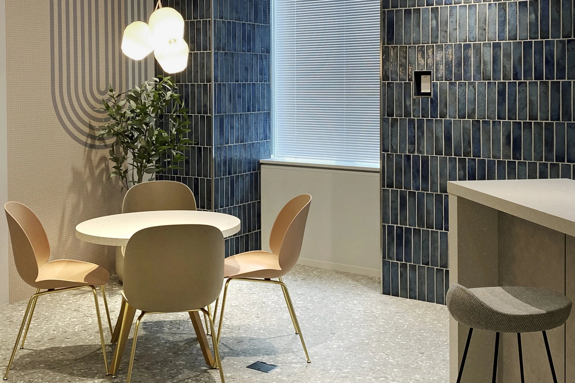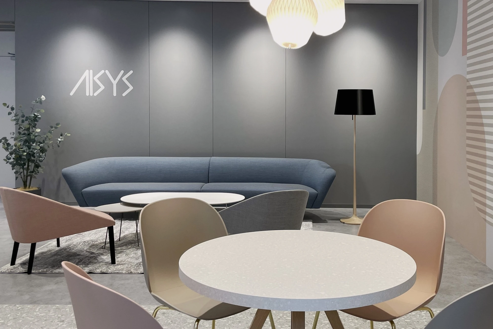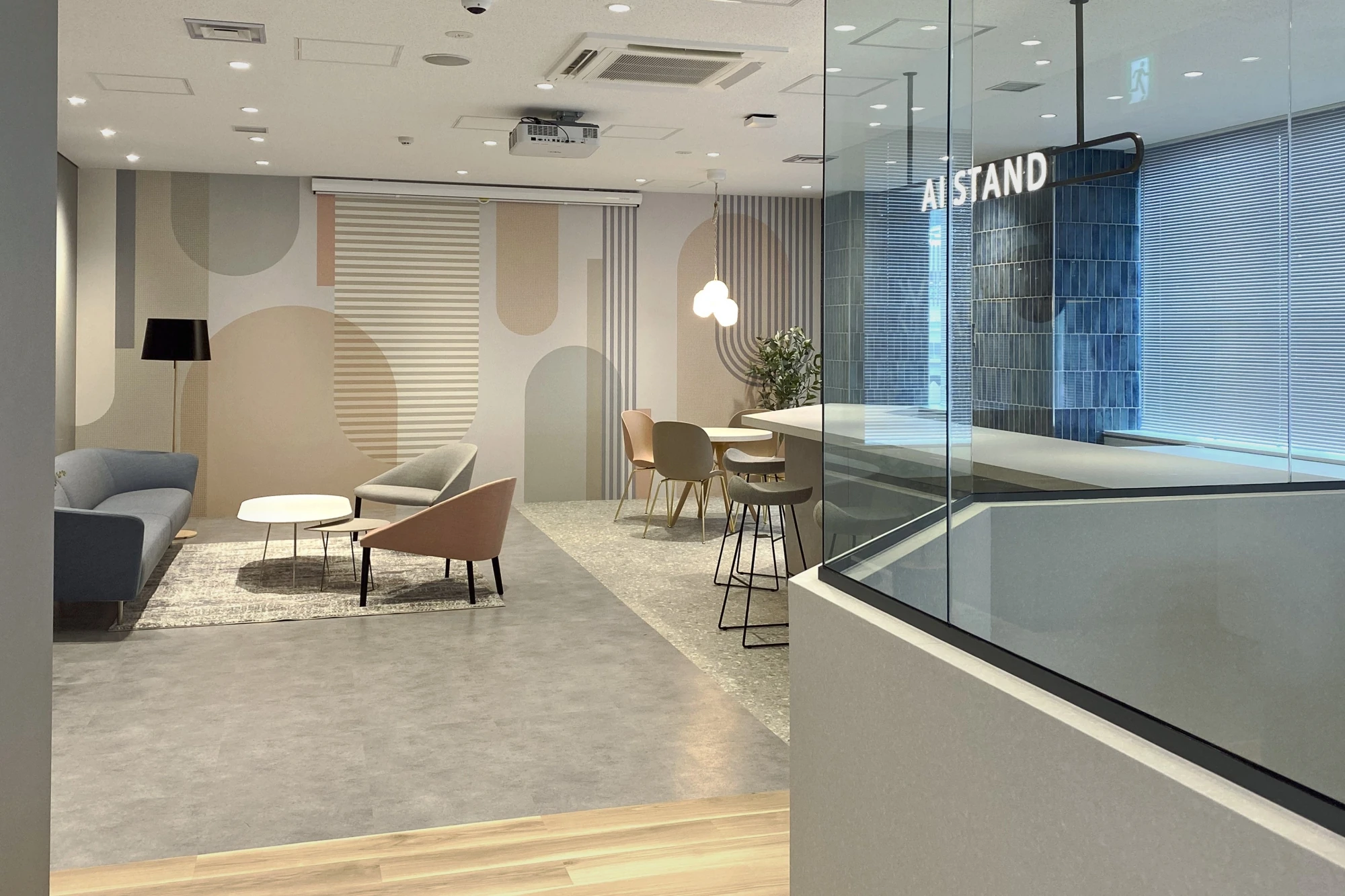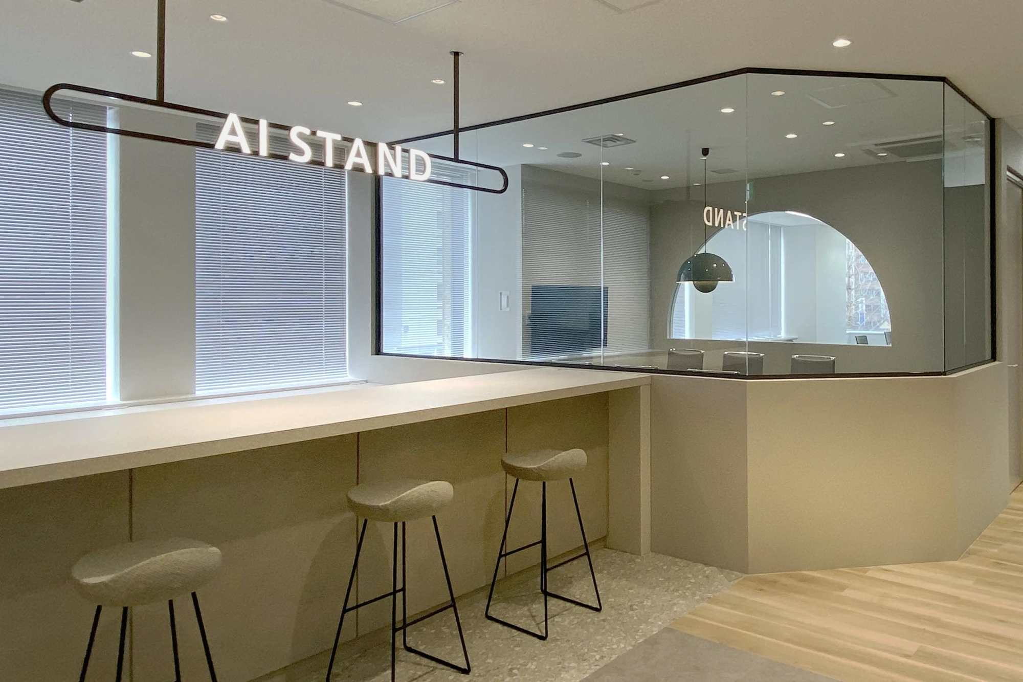 国内3拠点目のオフィス開設プロジェクトでした。ブランディングと採用を目的にオフィスデザインを行いました。エントランスには他拠点同様の発光サイン「AI STAND」を象徴的に配置しています。飲食も可能なリフレッシュスペースとワークスペースの両方の機能をもたせ、社員の皆さまが集まりやすいスペースにしています。グラフィックウォールや家具、通路の開口部などデザインは全体的に丸みを持たせ、ニュアンスカラーを用いて優しい印象を演出しています。訪れる方にとって親しみを感じられるオフィスになりました。