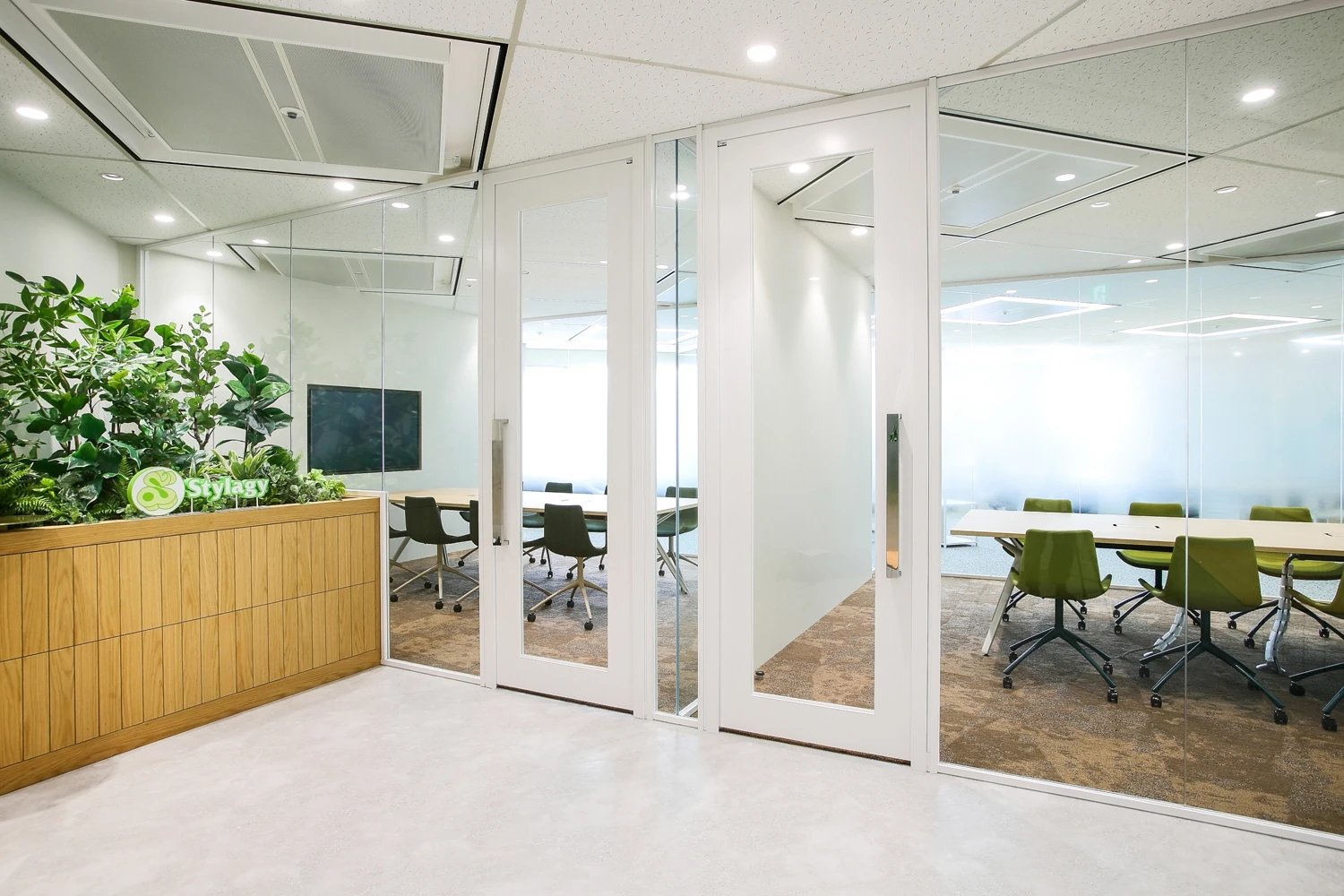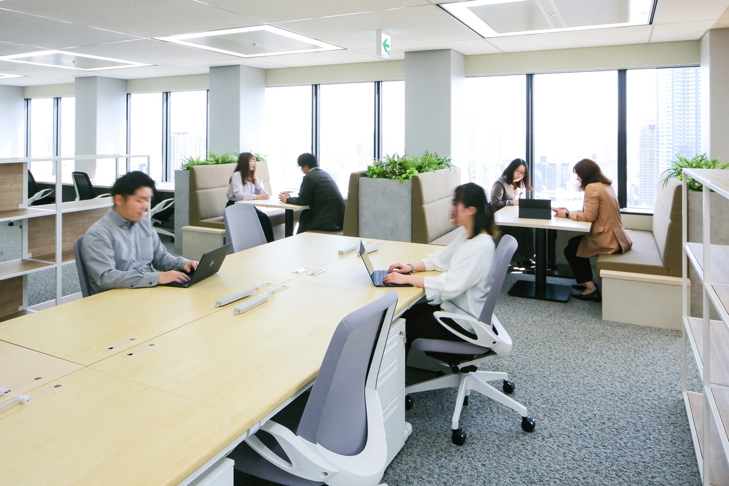 東京オフィスに引き続き、大阪オフィスの移転プロジェクトを担当しました。はたらき方はテレワーク中心でオフィスへの出社は週2,3回ということで、東京オフィス同様ABWができるオフィスにしました。出社する意味や価値を見出すことができるよう、はたらく場所を選択できるようにさまざまなタイプの席を用意しました。デザインのコンセプトは『STREET』。街を歩くと誰かに出会うように、このオフィスに来ると誰かと出会える。気分に合わせて場所を変えれば、そこでの偶発的なコミュニケーションからアイデアが生まれる。そんなサイクルをイメージし、動きのある動線とオープンなワークスペースをデザインしました。コンセプトに合わせ、内装はアースカラーとコーポレートカラーのグリーンを中心に、タイルや木、モルタル調の床などコンセプトを連想させる素材で構成しています。廊下からも開放的に明るく見せたいというところから、共用部の間仕切りにもガラスを取り入れました。オフィスに出社した際には、より良いコミュニケーションを取ることができる空間になっていれば幸いです。