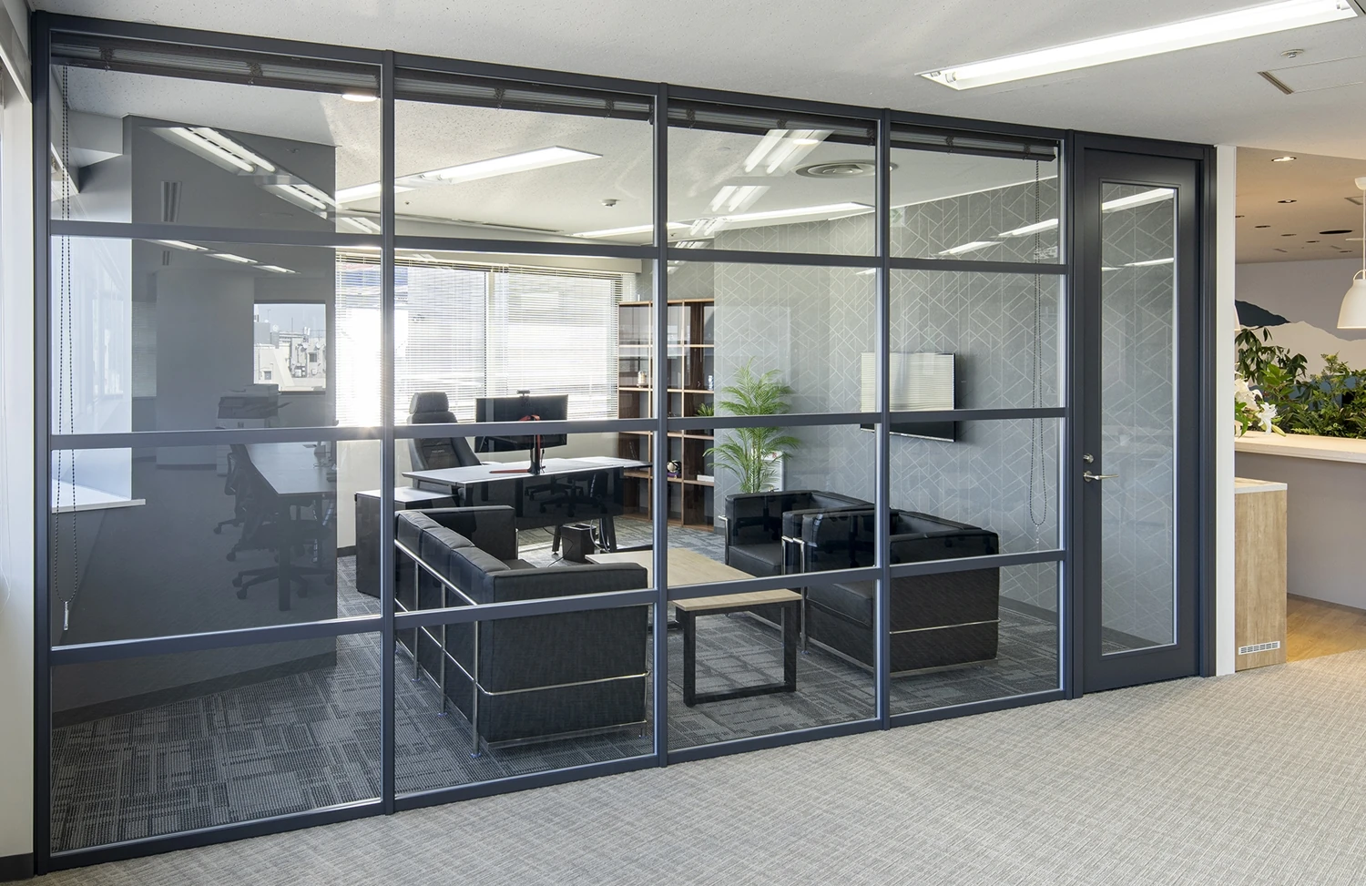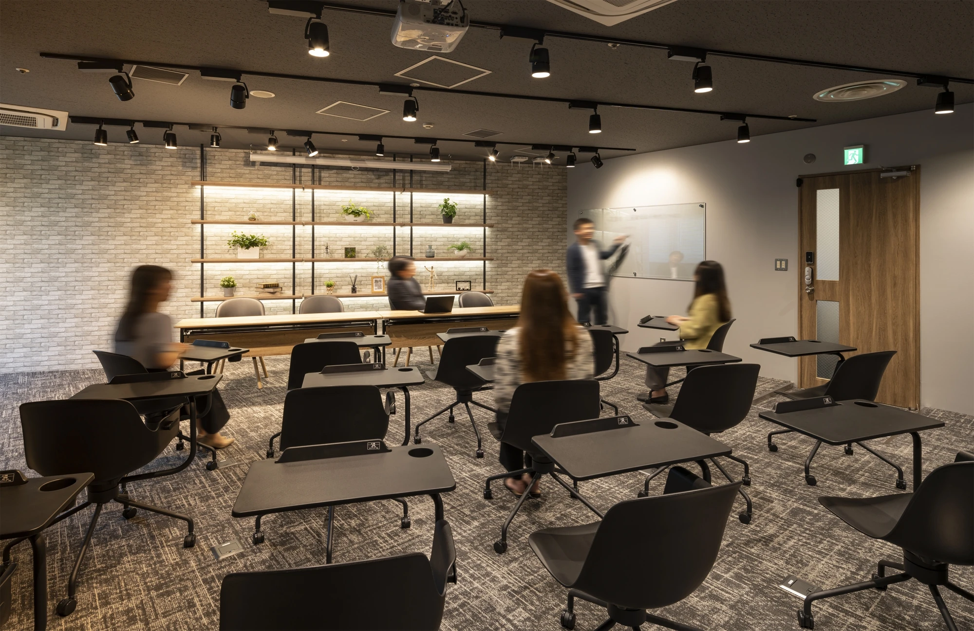 前回の東京オフィスご移転に引き続き、オフィス拡大の移転プロジェクトでした。今回は、会社として一体感を生み出し、コミュニケーションを増加させることを目的に『ONE TEAM』というコンセプトのもとワークプレイスを構築しました。ビルの形に合わせて個室を斜めに振ることで空間を効率よく使い、奥に行くにつれて広がりを感じられる開放感のある空間をデザインしています。特にワークスペースは、立地の良さも相まって、廊下から良い景色を突き抜けて見ることができます。以前に引き続きフリーアドレスでの運用のため、リフレッシュエリアや集中席など様々な席を充実させ、社員間のコミュニケーション活性化に繋げました。デザインは、コーポレートカラーであるブルーを基調にまとめ、一体感=『ONE TEAM』を演出しました。配信スタジオはこだわりを持って計画し、調色調光式のスポットライトや間接照明を使うことで細かく空間演出の設定ができる環境をつくり、撮影に特化した空間をつくりました。デザインはモノトーンでシックにまとめ、落ち着いた空間となっています。オフィス全体がオープンな空間で、『ONE TEAM』を育むことができるワークプレイスになりました。