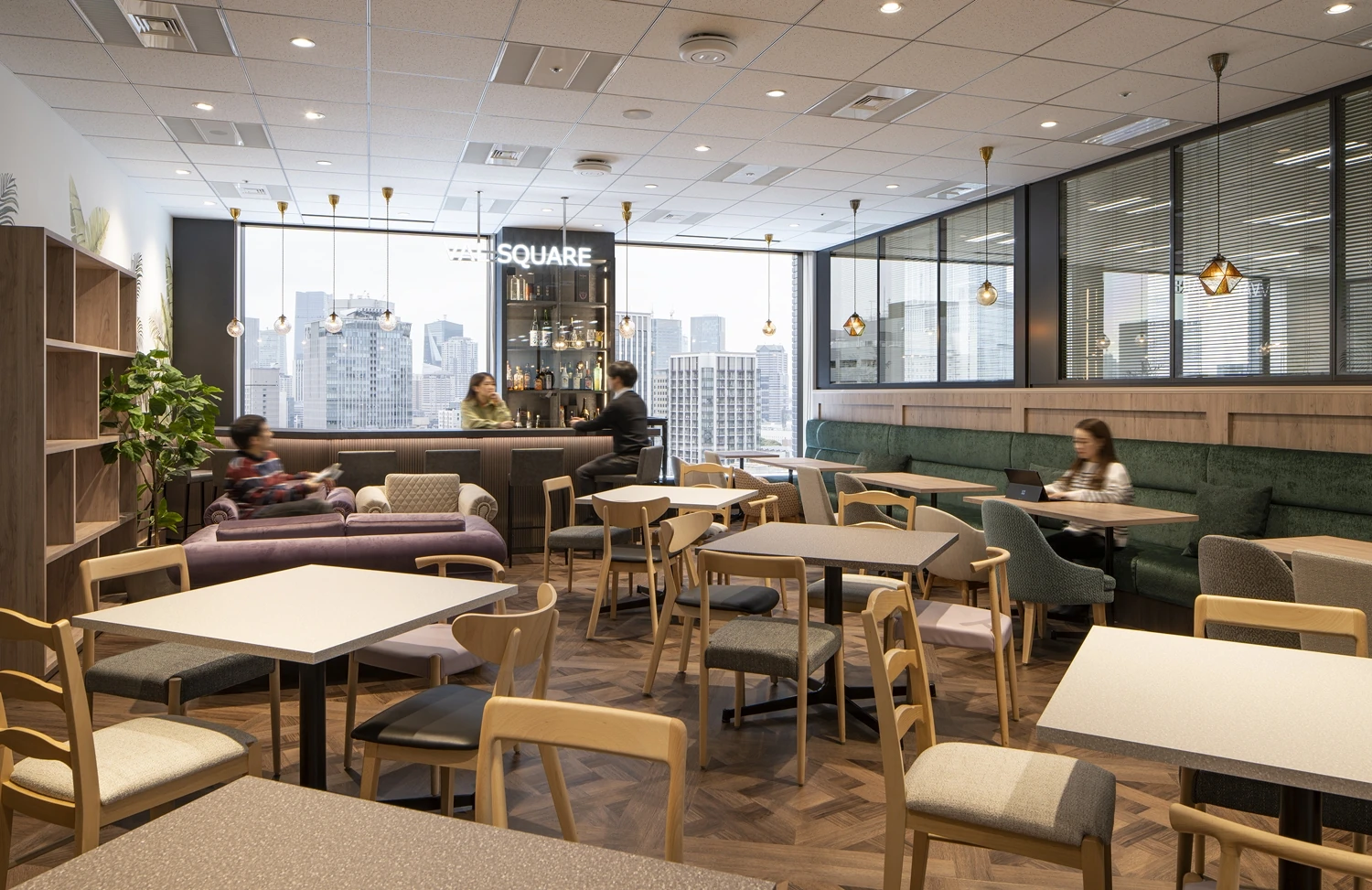 採用強化とコミュニケーション活性化を目的としたオフィス移転プロジェクト。「自然を感じられるオフィス」というテーマのもとプランニングを行いました。デザインはエリアごとにテイストを変えており、カスタマーエリアはアースカラーをベースにグリーンの映える空間に。社員のワークエリアはペールトーンのカラーをベースに、やさしく、清潔感のある空間として設計しています。エントランスからリフレッシュエリアにつながる動線は川の流れをイメージし壁を斜めに構成することで躍動感を演出しつつ、シンプルにグリーンが映えるようデザインしました。全体的に回遊動線を意識し、ガラスで区切ることで各々の空間が視覚的につながるように計画しています。ワークエリアの個人ブースは有機的な形状とすることでオフィスのシンボルとなるようデザインしました。小上がり席は建物最上階からの素晴らしい眺望を取り込んでおり、スカイビューラウンジとして憩いや集中作業の場としています。どのエリアにも植栽を配置し、自然を感じながらはたらくことができるようにしました。リフレッシュエリアでは定期的に社内イベントを開催し、コミュニケーション醸成の場としても有効活用できるオフィスです。