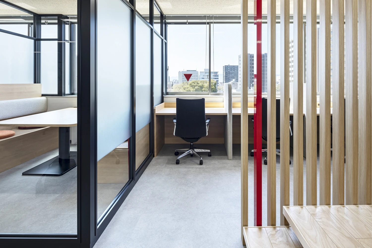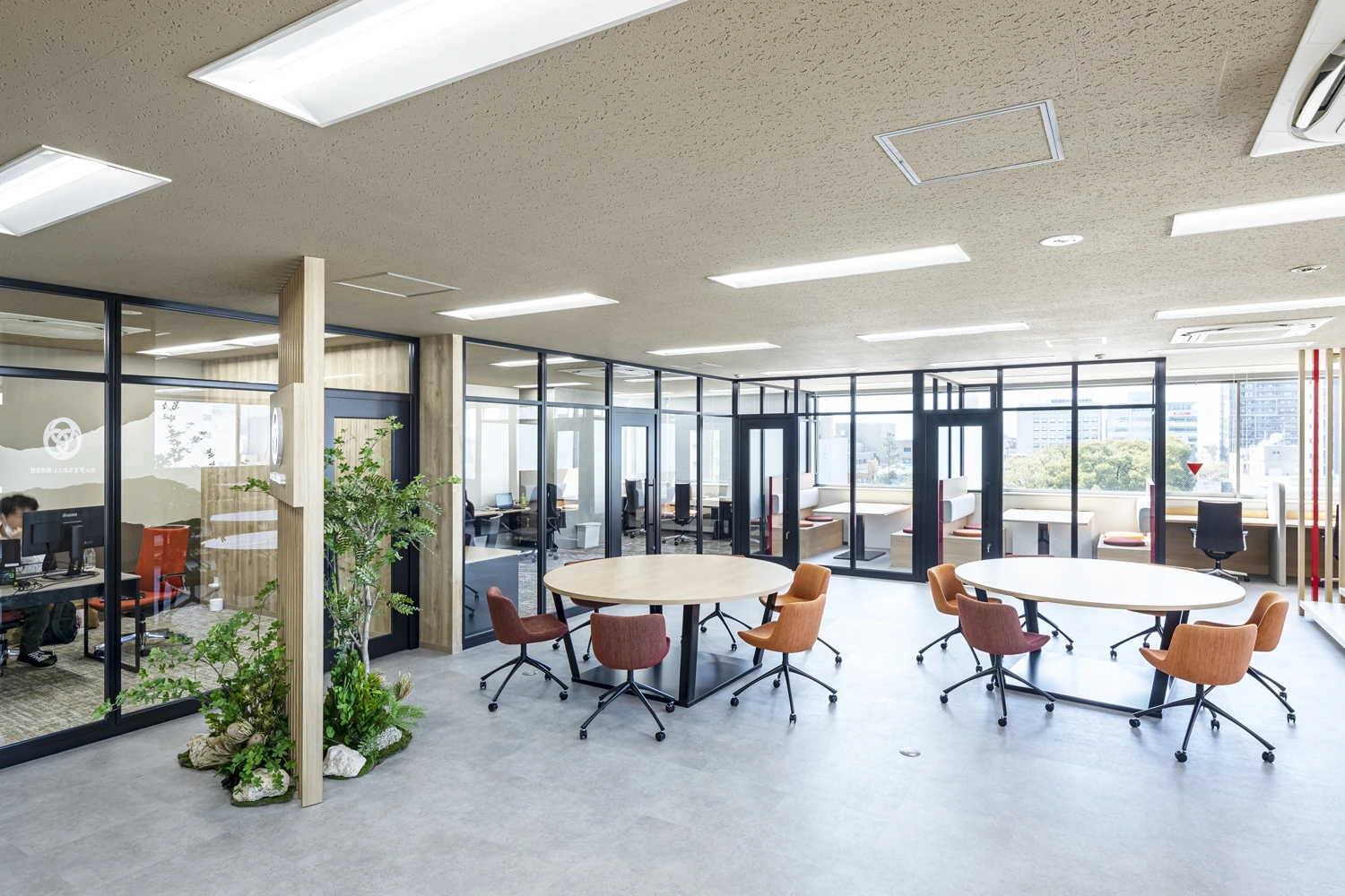 十六フィナンシャルグループが設立した新会社のオフィス開設プロジェクト。伝統ある神田町商店街から未来を発信し、まちおこしのために尽力する人やパワー、アイデアが集まる場所となるようデザインしました。まちおこしをする人が集まる引力となるコミュニティスペースを中央に広くとり、多くの人が集い活動ができるようにしました。岐阜の伝統とこれからの未来を融合する空間となるよう、デザインは伝統とモダンを融合させています。