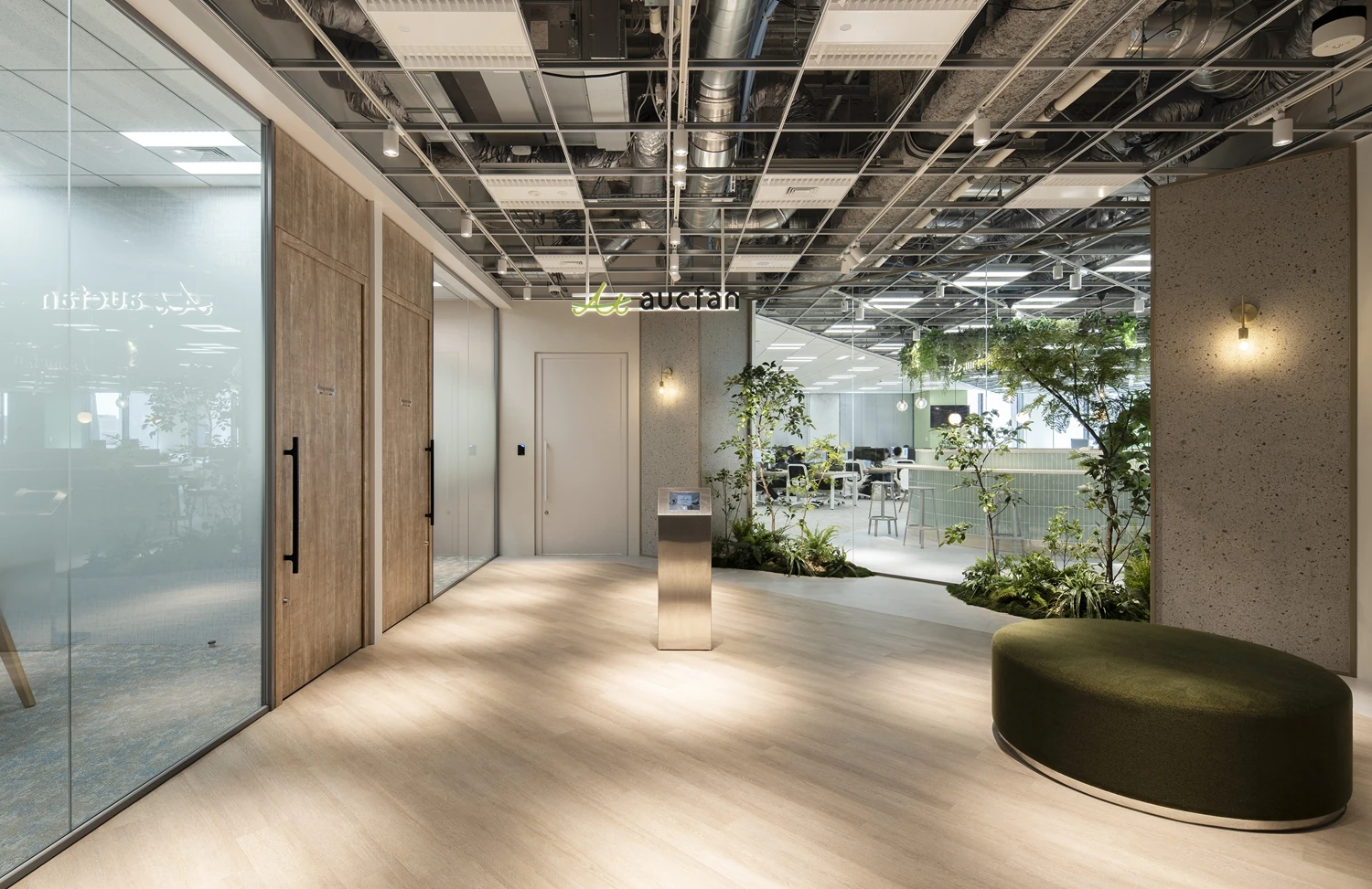 コンセプトを『Re-Café terrace』とし、「朝の爽やかなカフェ」をイメージして自然の要素とカフェ空間が馴染む空間づくりをしました。コーポレートカラーのグリーンを取り入れて企業らしさを表現し、スケルトン天井を採用して景観を意識した開放的なデザインにしています。レイアウトは、人が集まりやすいオフィスの中心にオープンミーティングエリアとパントリーカウンターを設置し、その両サイドにベースとなるワークスペースを配置しました。窓際には集中スペースやWEB会議ブースを設置し、仕事に合わせてはたらく場所を選ぶことができるABWを採用しています。結果として出社率が上がり社内のコミュニケーションも増加させることができました。